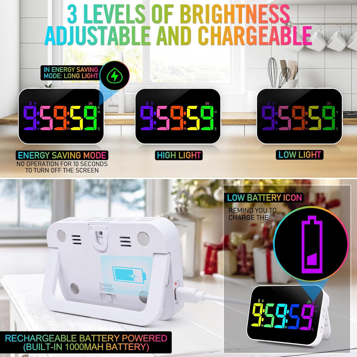 TXL Kitchen Timer for Cooking, Rechargeable Digital Magnetic Timer with Large LED Display, Loud Alarm, Sound Countdown, 4 Volume Levels and 3 Brightness for Classroom, Study (RGB)