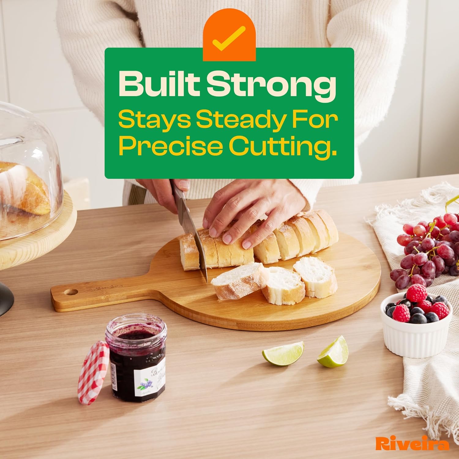 - Premium Crafted Bamboo — Take a detour from traditional kitchen aesthetics with this brown bamboo wood board crafted from 100% natural bamboo. Beyond being an unconventional and eco-friendly choice, the chopping board wood proudly showcases the environment friendly and organic bamboo. This wood cutting boards for kitchen counter adds an unexpected touch of confidence and style to your once-orderly culinary space. Riviera's wooden chopping boards for kitchen will be there for many years to come.