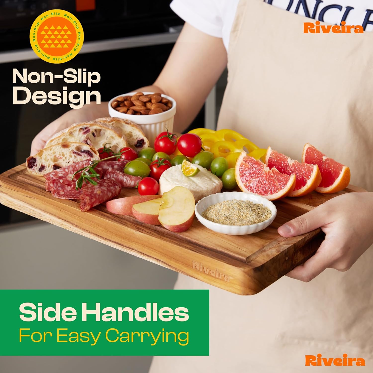 - Premium Crafted Teak — Take a detour from traditional kitchen aesthetics with this teak wood board crafted from 100% natural teak. Beyond being an unconventional and eco-friendly choice, the chopping board wood proudly showcases the environment friendly and organic teak. This wood cutting boards for kitchen counter adds an unexpected touch of confidence and style to your once-orderly culinary space. Riviera's wooden chopping boards for kitchen will be there for you for many years to come.