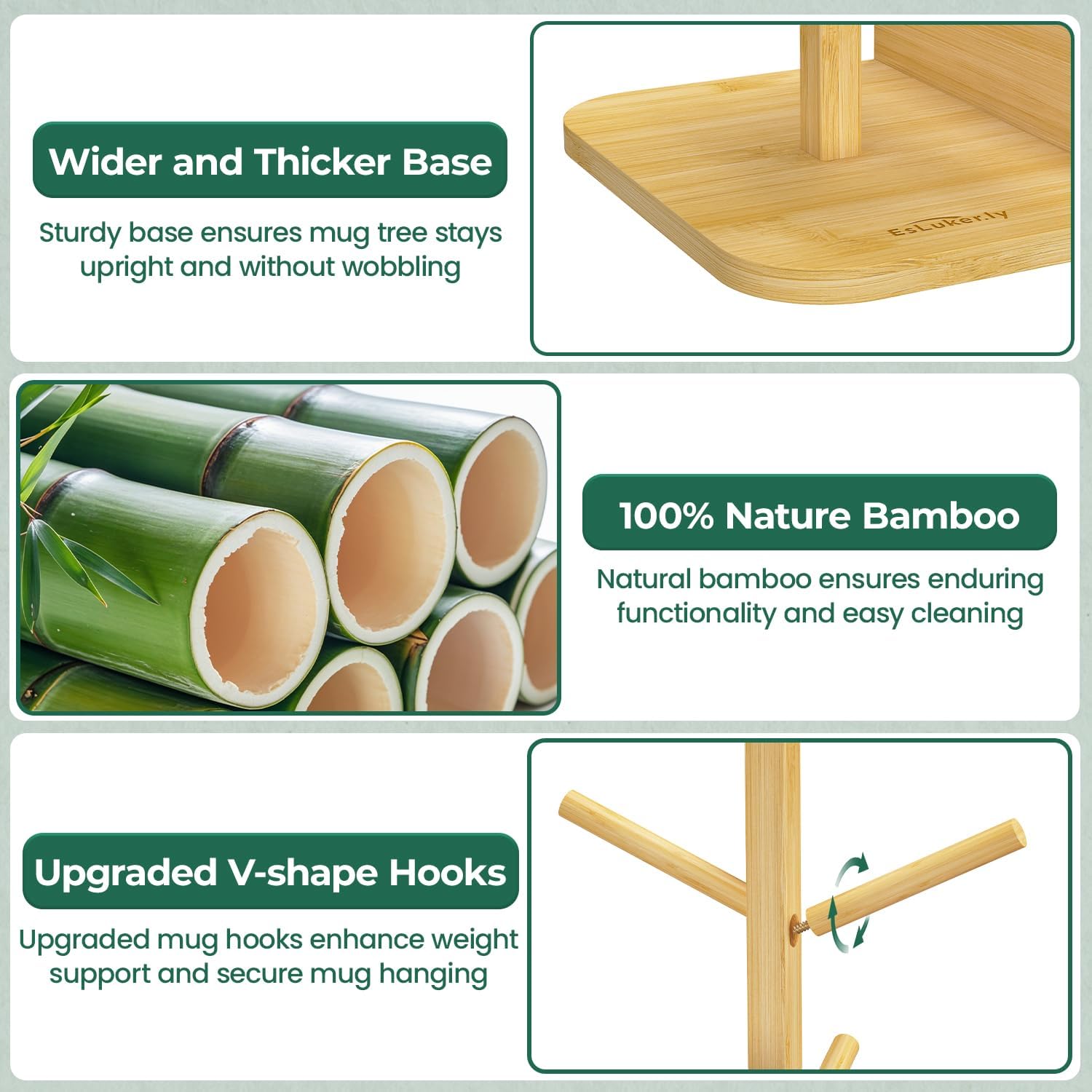 EsLuker.ly Mug Tree Holder Stand, Countertop Bamboo Coffee Cup Organizer Rack for Kitchen Office, Space-Saving Coffee Station Bar Organizer with 6 Hooks, Modern Design Enhances Decor