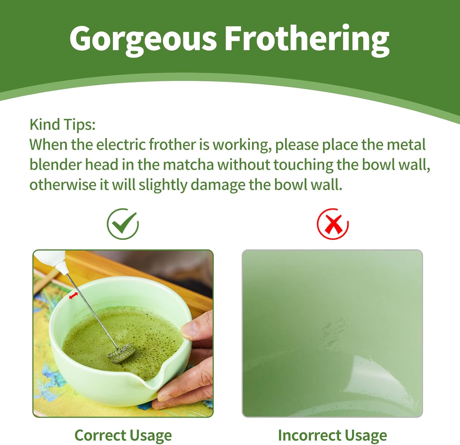 - 【Matcha Whisk Set】1 * Matcha whisk (Chasen), 1* matcha bowl with spout (Chawan), 1* ceramic whisk holder, 1* bamboo scoop (Chashaku), 1* tea cloth (Chakin), 1* scoop holder(Ceramic Stand), 1* matcha powder sifter, 1* 110ml matcha powder Canister, 1* rechargeable electric frother (no batteries required), 1* user's mannual.