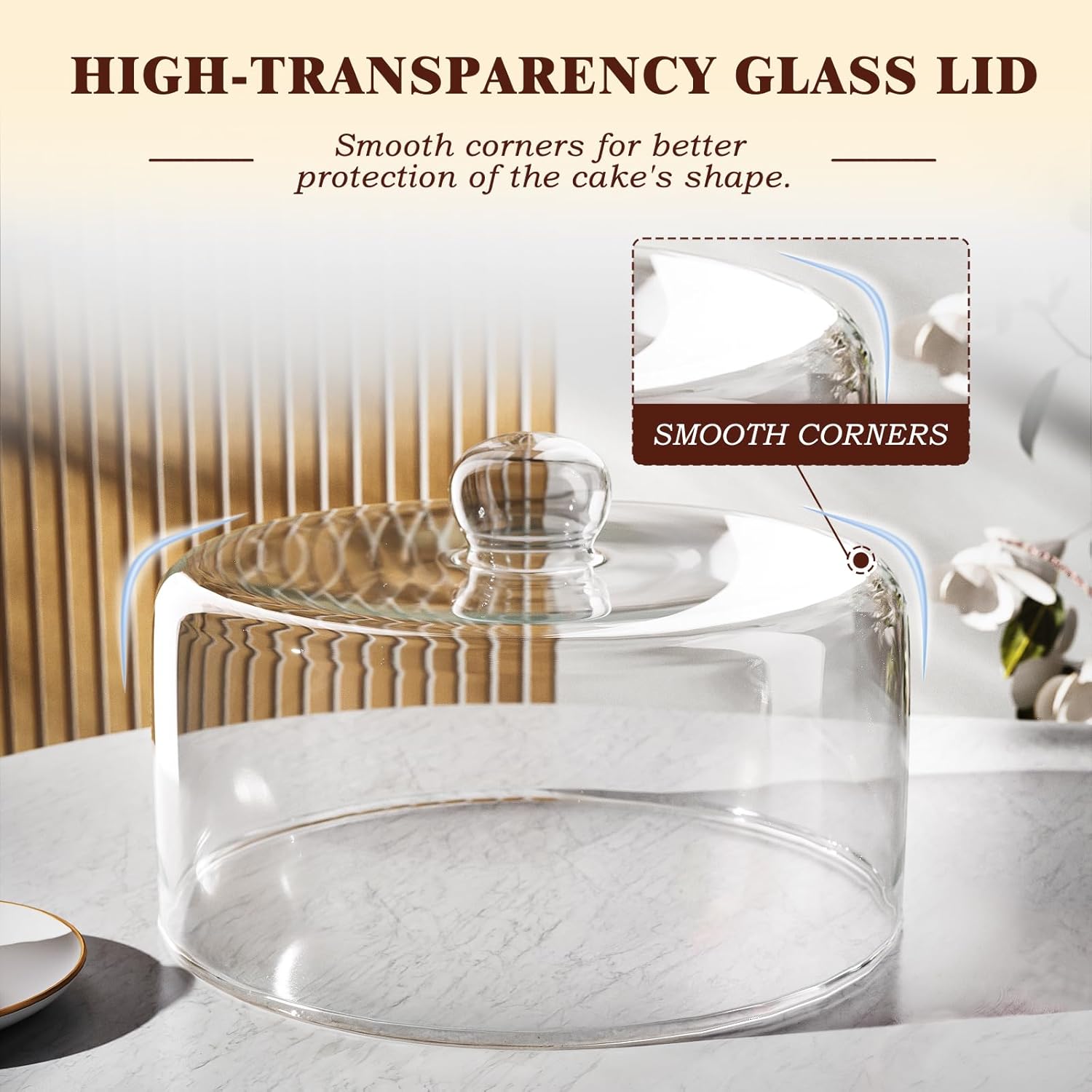 - 【Spacious Glass Dome Lid】Upgraded 90-degree angled glass dome lid prevents contact with delicate decorations, accommodating 4-inch tall cakes with floral designs. Unlike acrylic covers, our shatterproof glass cake stand with dome ensures your creations stay intact – perfect for wedding cake stands and professional bakeries.