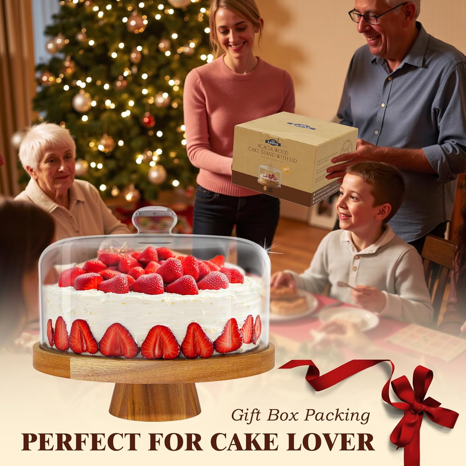 - 【2CM Acacia Wood Base & Wide Foot】Premium 2cm-thick acacia wood cake plate resists warping, paired with a 13cm-diameter widened wooden foot for anti-tip stability. Safely hold heavy cakes or charcuterie. Cake stand with lid combines rustic charm and modern durability for kitchens and events.