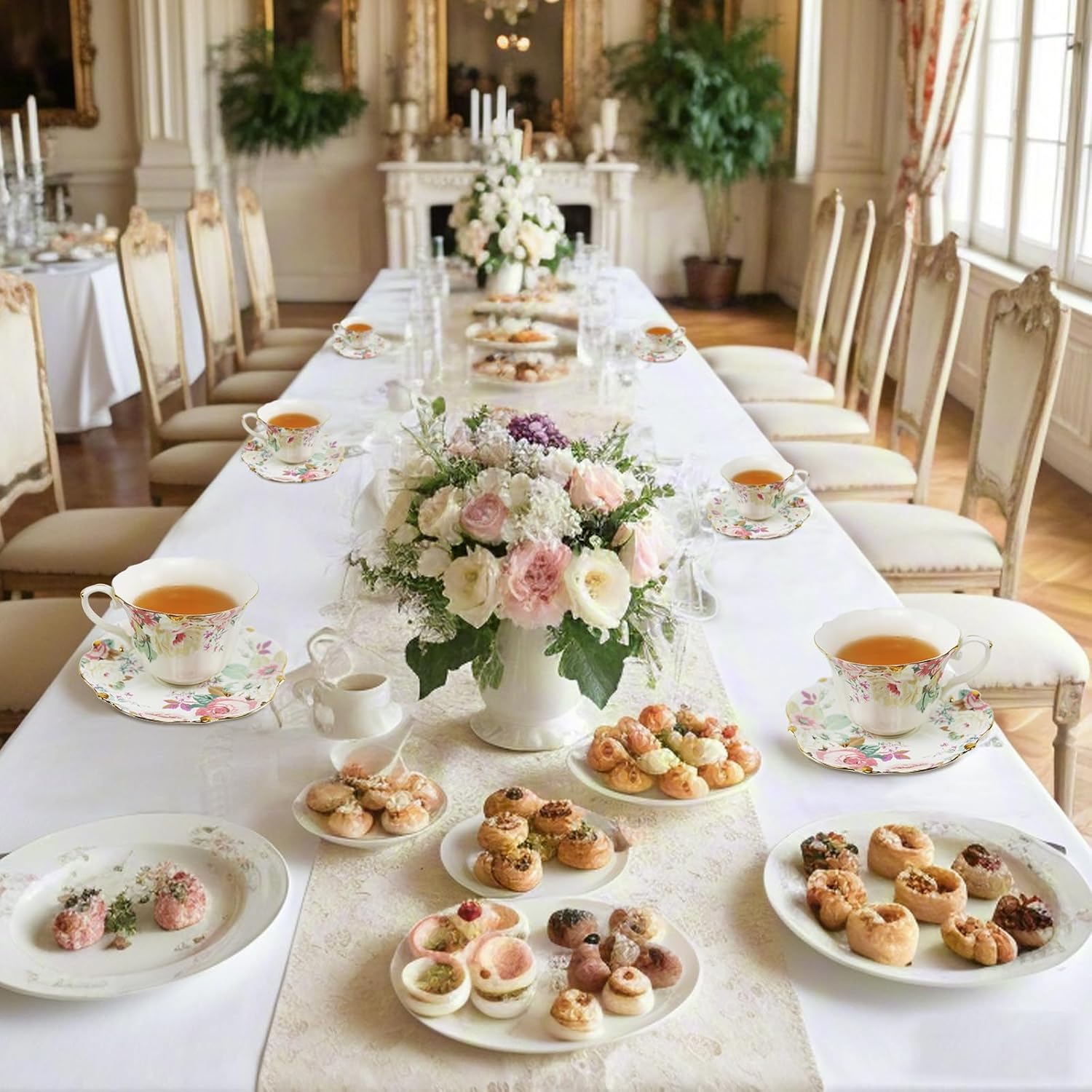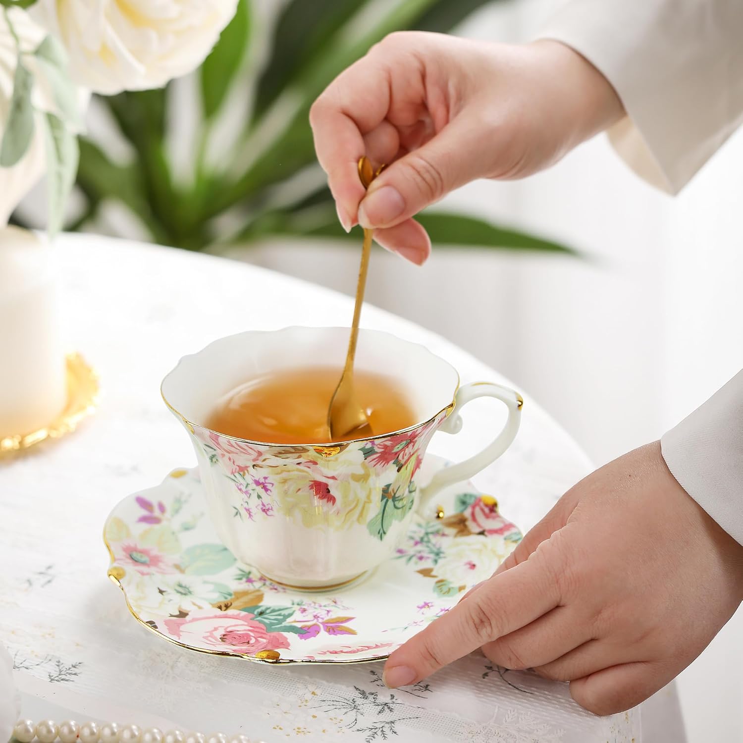 TATSUMI Country Roses 18 Peices Bone China Tea Cup And Saucer Set, English Vintage Tea Cups Of 6 For Women And Tea Party Sets(Pink,6 sets)