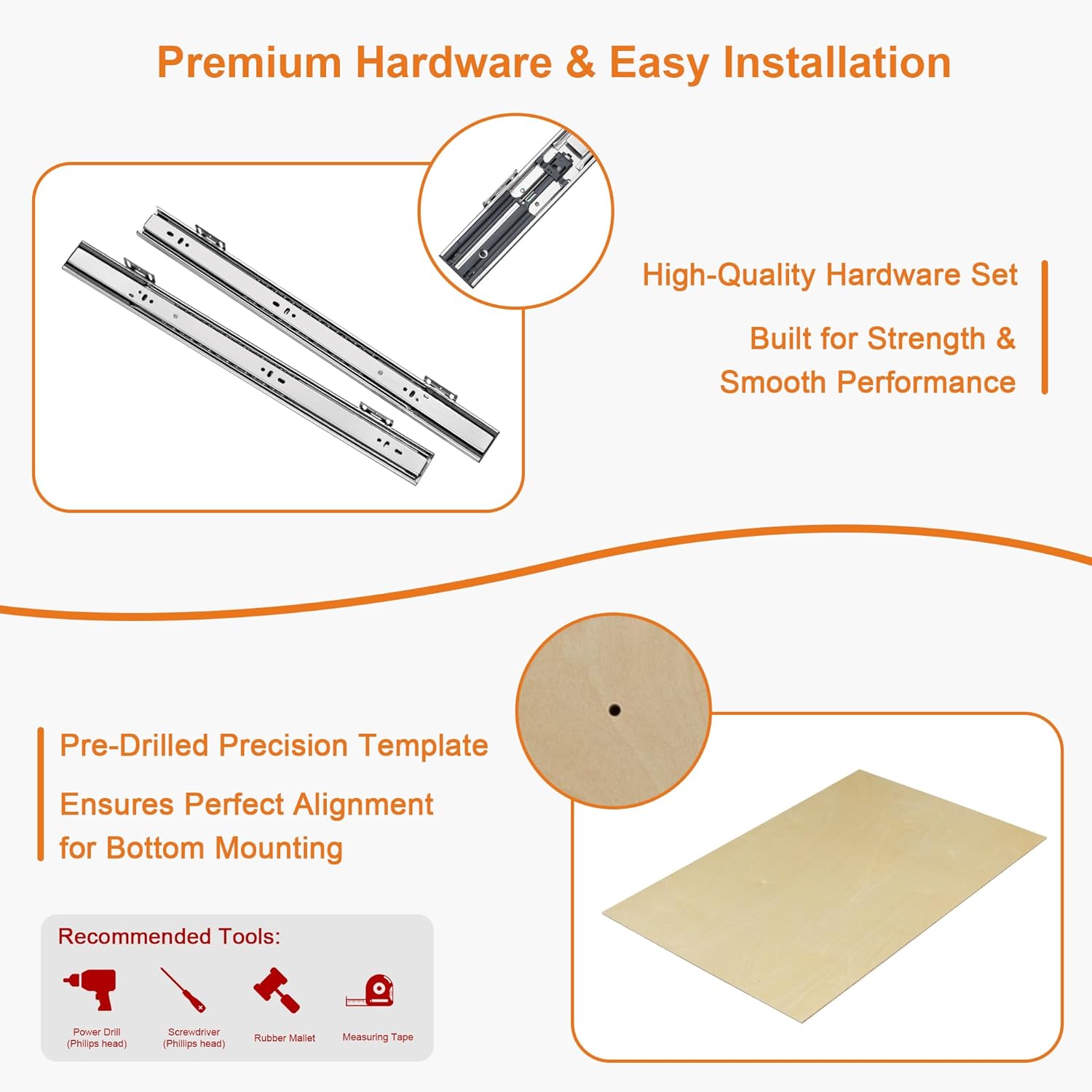 - Pre-Drilled Wood Template (Guide & Shim) - The included template measures 16-1/2"W x 22-1/2"D x 3/16" thick; for frameless cabinets, the opening must be ≥ 16-1/2" to use it untrimmed, otherwise trim the template edges to fit (and the template can also act as a thin shim to level a small lip)