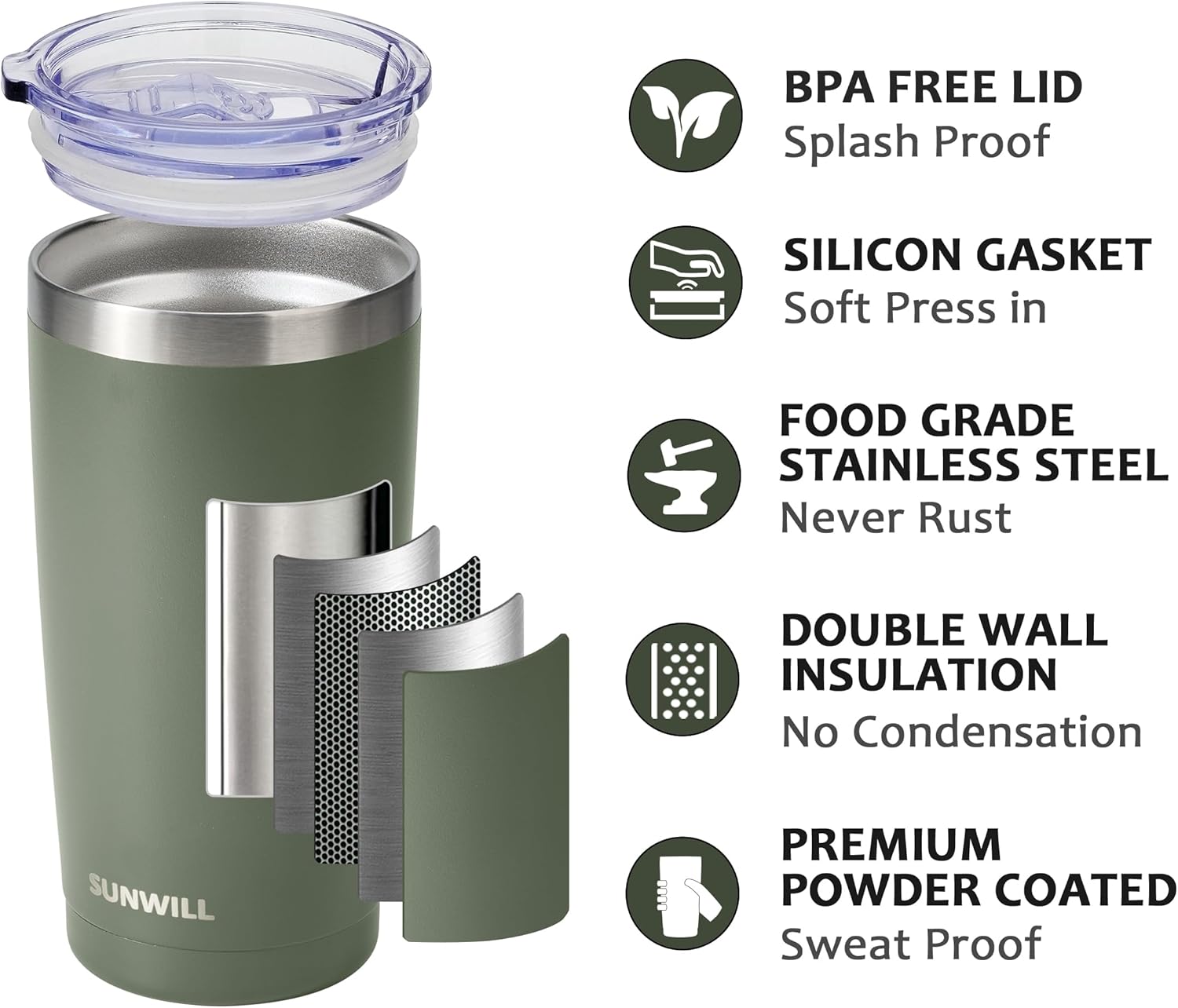 SUNWILL Travel Coffee Tumbler 20 oz, Insulated Mug with Lid, Stainless Steel Iced Cup for Outdoor, Powder Coated Camp Green