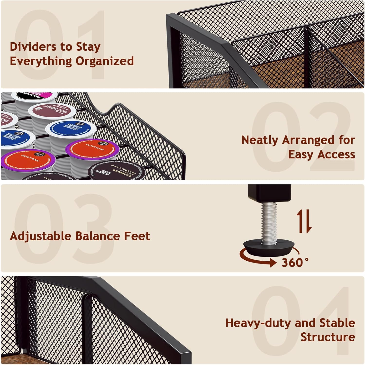 - [Customize Your Coffee Experience] Your coffee station should reflect your unique style! With adjustable dividers, you can create the perfect layout for coffee cups, stirrers, sugar packets, and tea accessories. Whether you like things minimal or fully stocked, this coffee pod holder adapts to your needs.