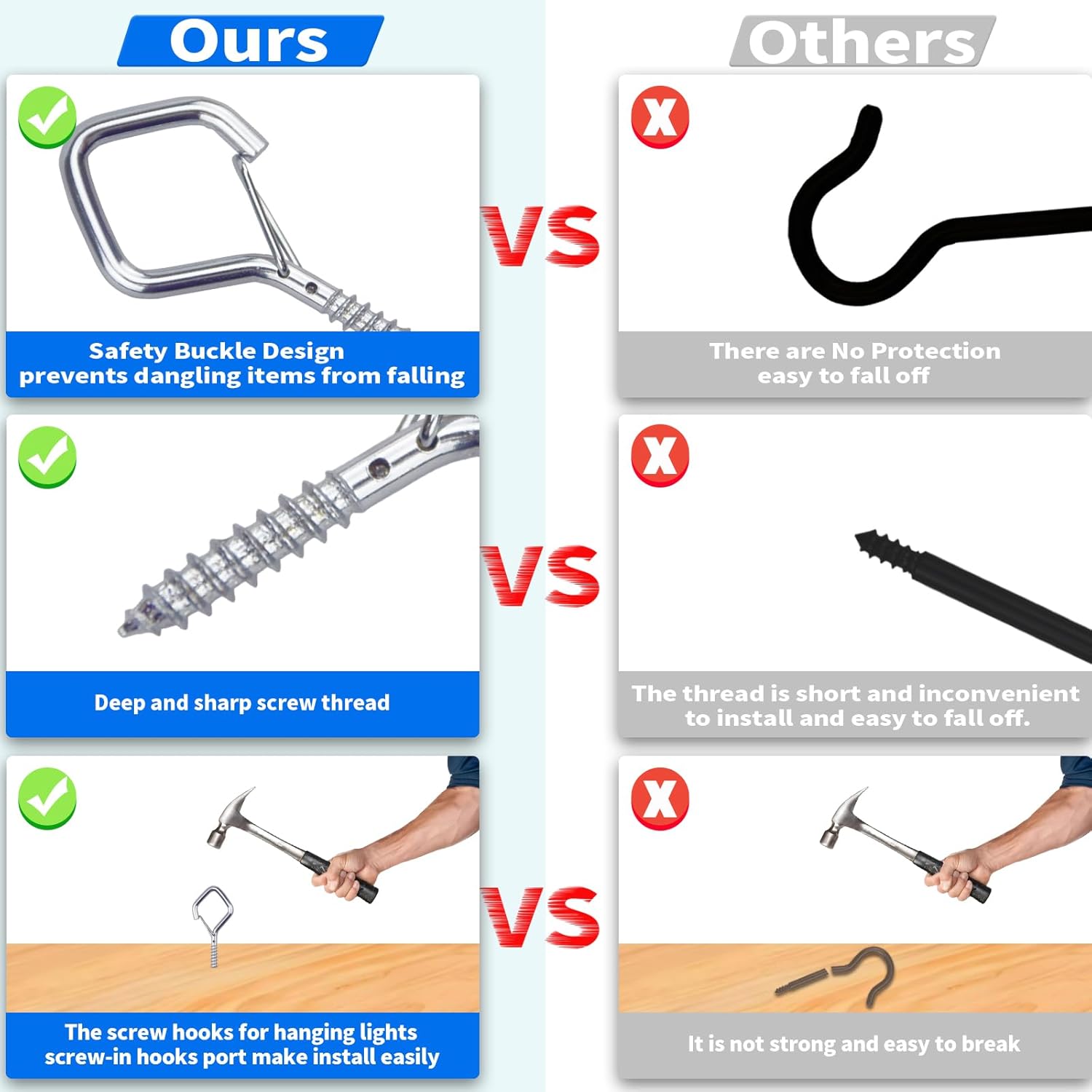 - 🔧 Wide application: This screw in hook is designed specifically for hanging Christmas lights, outdoor string lights, and plants, making it very suitable for indoor and outdoor use.