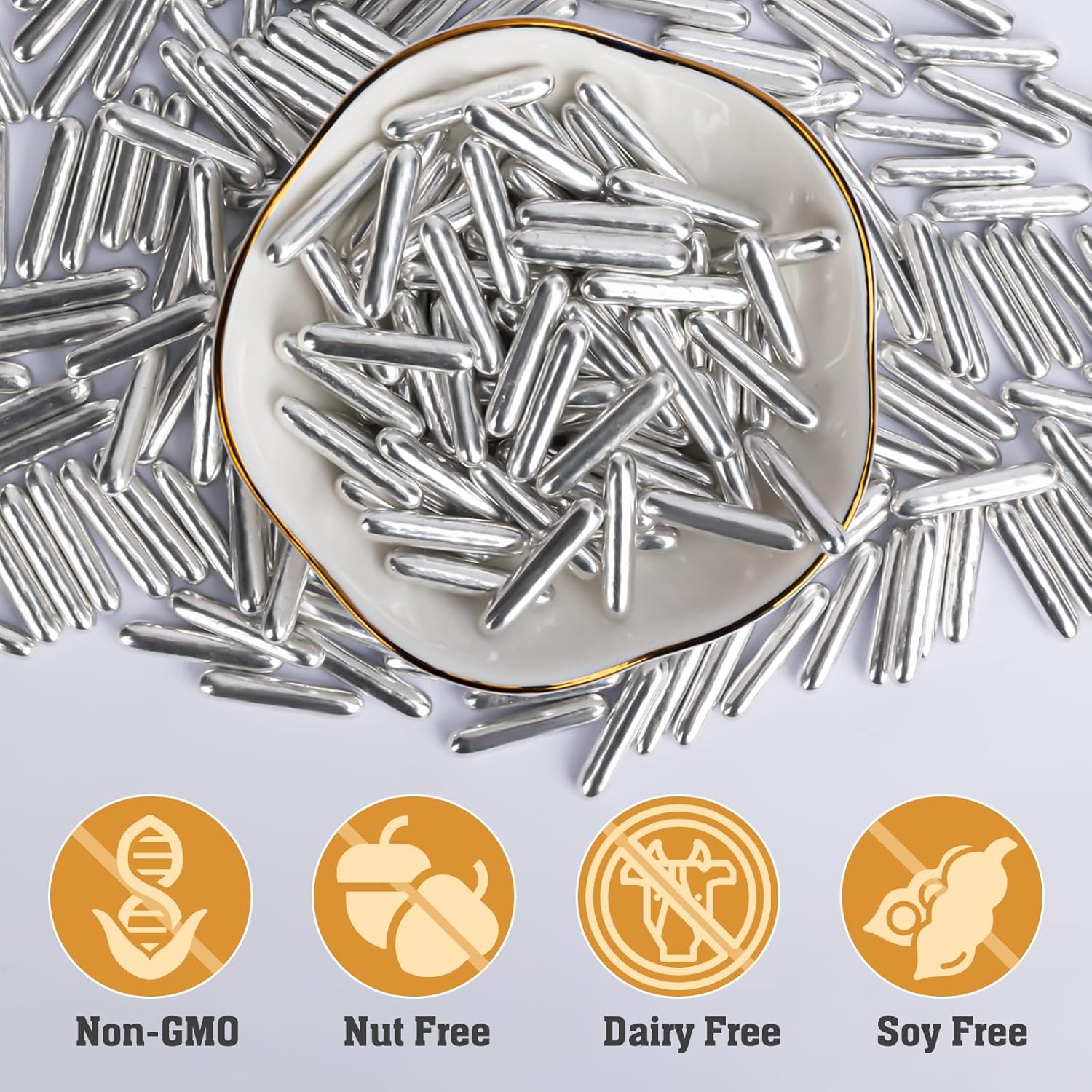 - 【100% Food-Grade Silver Sprinkles】: Twisweet silver rod sprinkles are made with international food-grade ingredients and a vegan-friendly formula, free from major allergens (nuts, dairy, gluten). Crafted from natural cane sugar and produced in compliance with FDA guidelines, these sugar sprinkles contain no added preservatives, ensuring they're both delicious and suitable for a variety of diets.