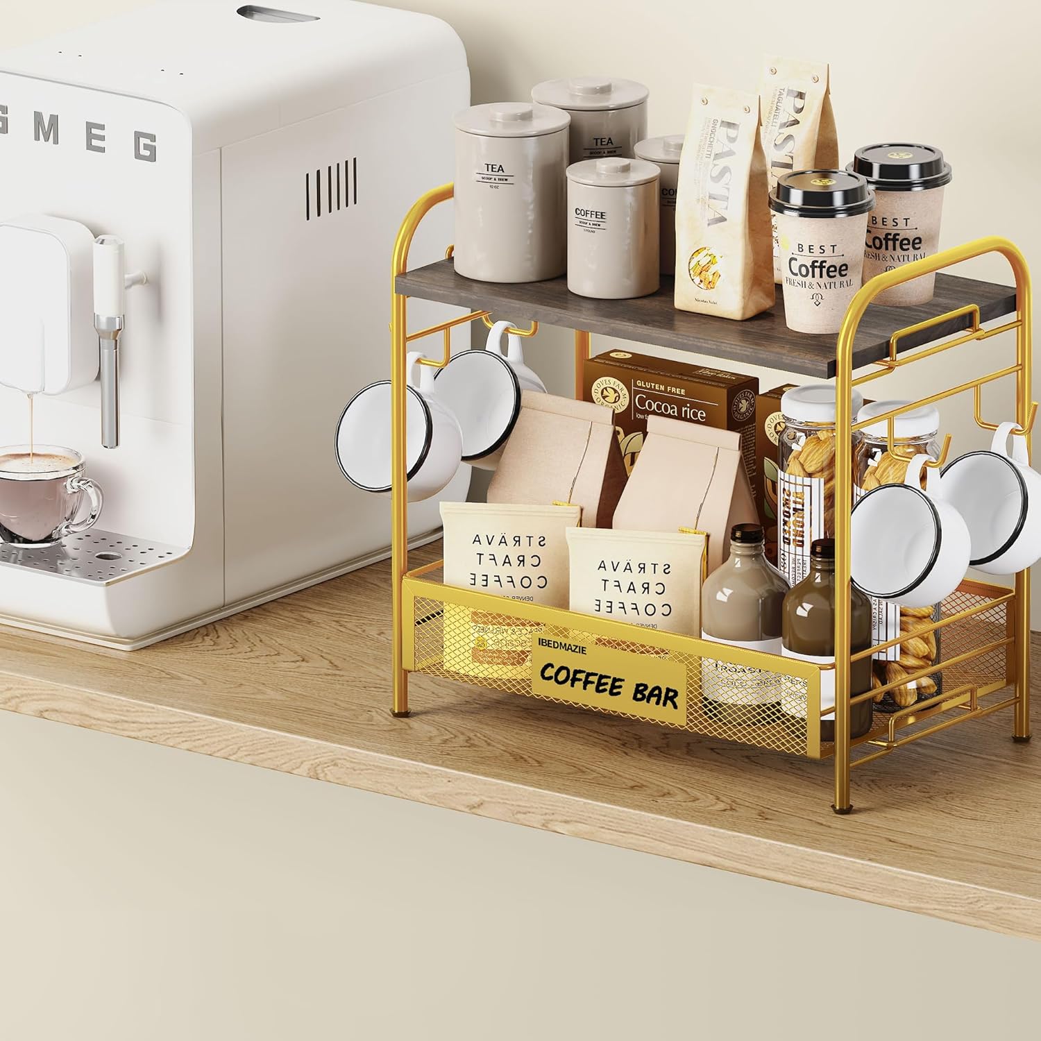 Coffee Bar Organizer for Countertop Station, Simple Assembly 2 Tier Shelf for Home,Office, Coffee Cup Holder Storage Organization for Counter Accessory Storage Rack with 4 Hooks Space-Saving