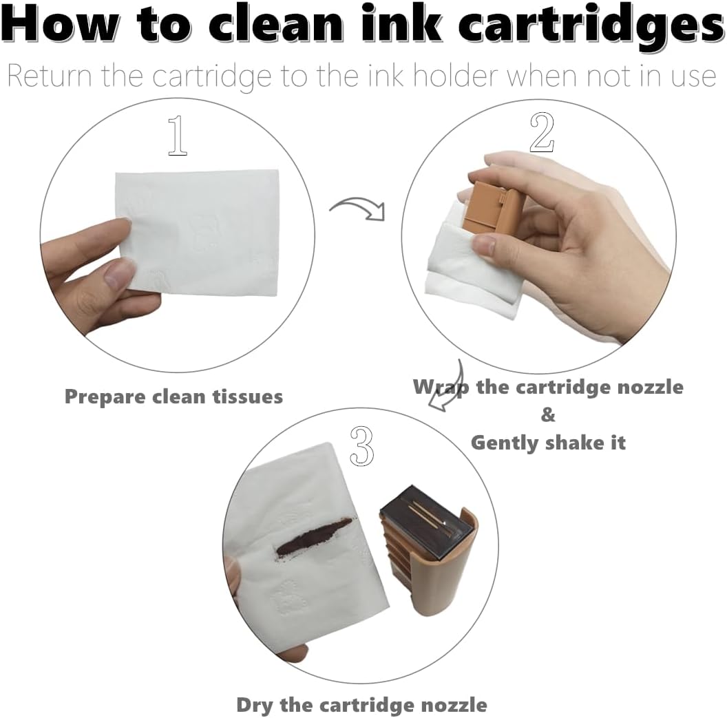 - Troubleshooting: If the print pattern is incomplete, the ink cartridge may be clogged. Gently wipe the nozzle with a tissue in one direction. If the machine is not used for 2-3 days, remove the ink cartridge and place it in the protective clip; do not leave it out. Unopened ink cartridges can be stored for 12 months. Once opened, please use within 6 months
