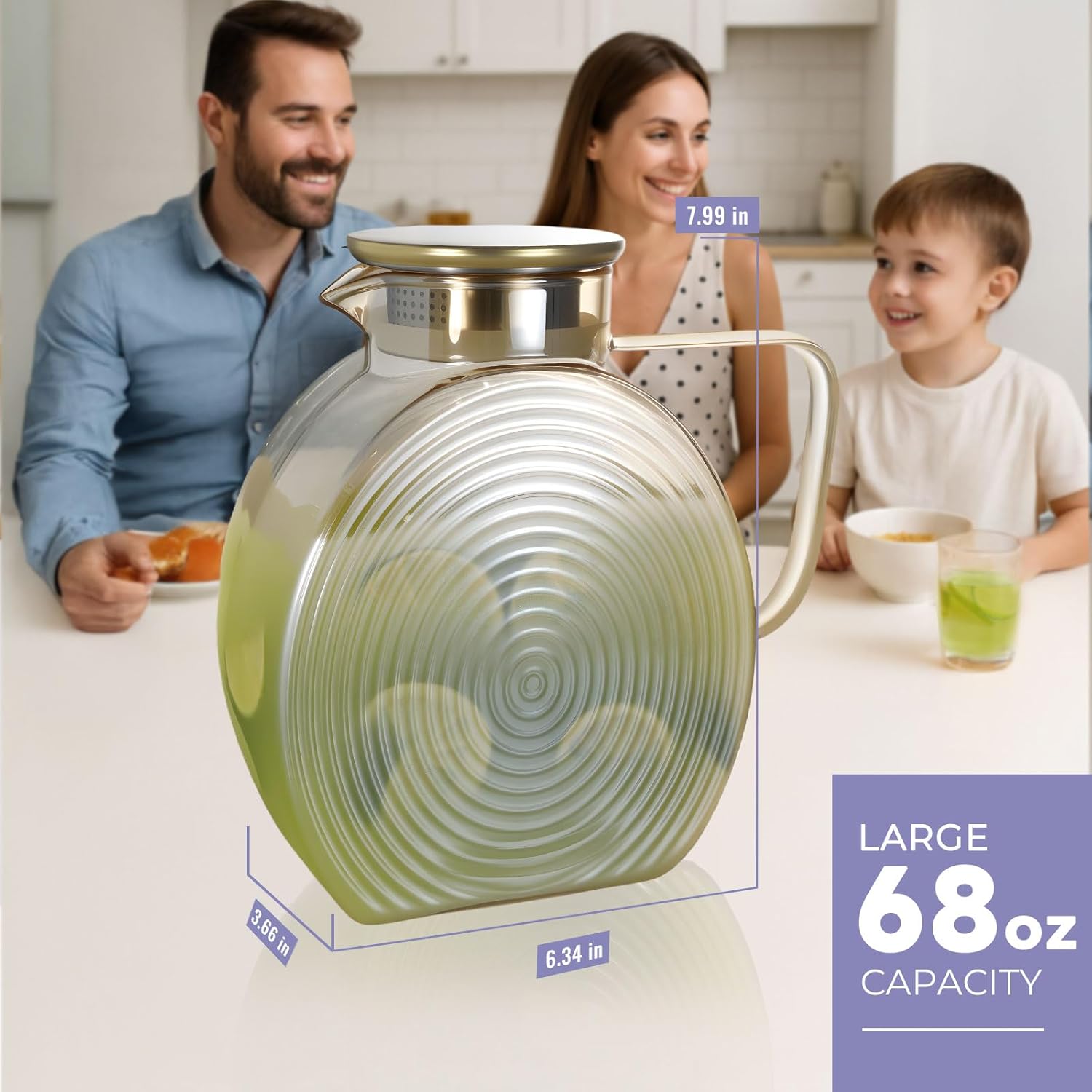 - Perfectly Sized Capacity: With a generous 2.0 Liter or 68 oz capacity glass pitchers with handle and lid , It is ideal for serving homemade iced tea, juice, sangria, cocktails, coffee, or milk. Whether you're hosting a party, enjoying a picnic, or need a stylish glass jugs for your bar, the leak-proof WARMSIMPLE glass jug has got you covered.
