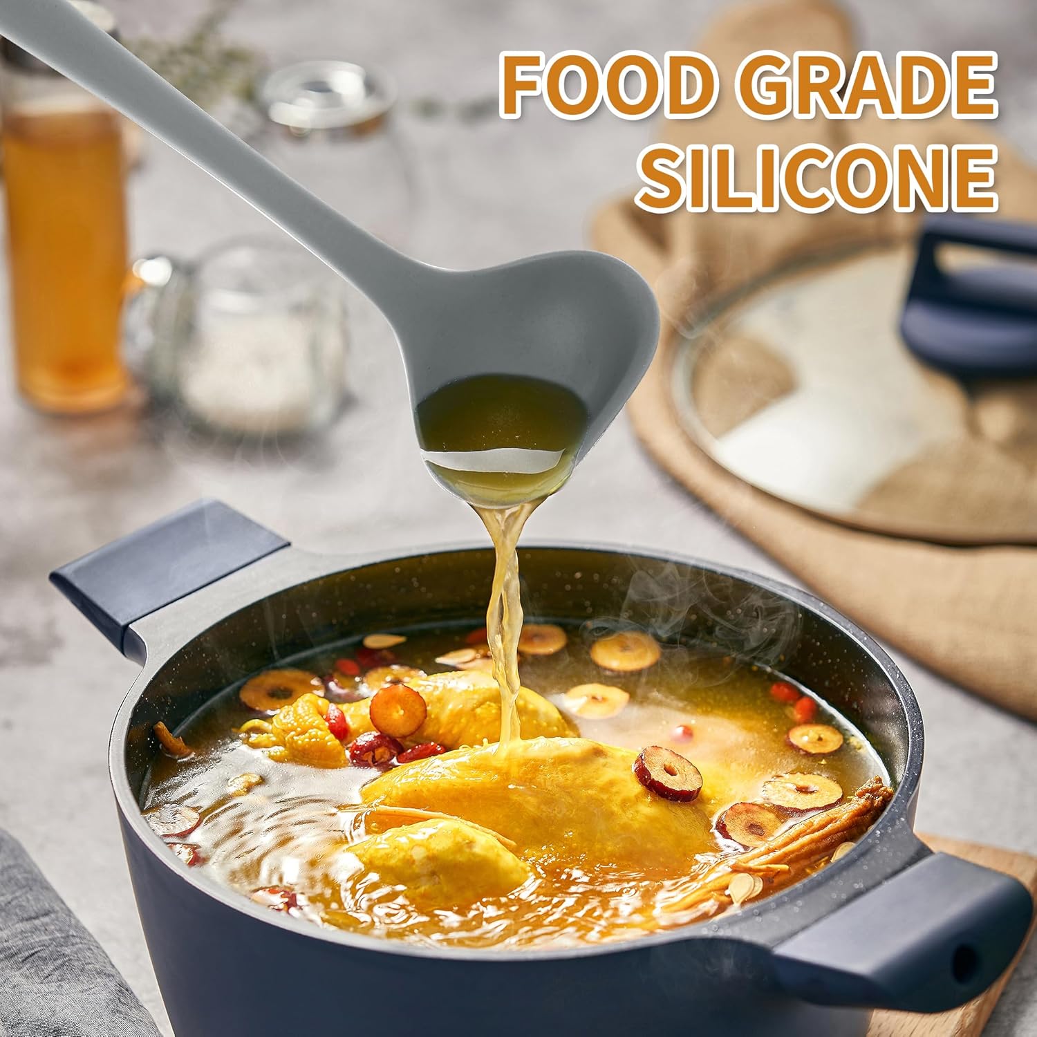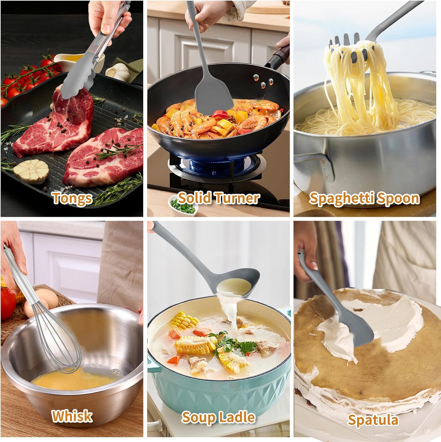 • ESSENTIAL KITCHEN TOOLS: Include Slotted spoon, Solid spoon, Soup ladle, Slotted turner, Solid turner, Spaghetti spoon, Spatula, Tongs, Whisk, Silicone mat, Basting brush(ALL Silicone) + Plastic Egg separator and Measuring spoon. Meet all kinds of kitchen needs. From beginners to skilled cooks.