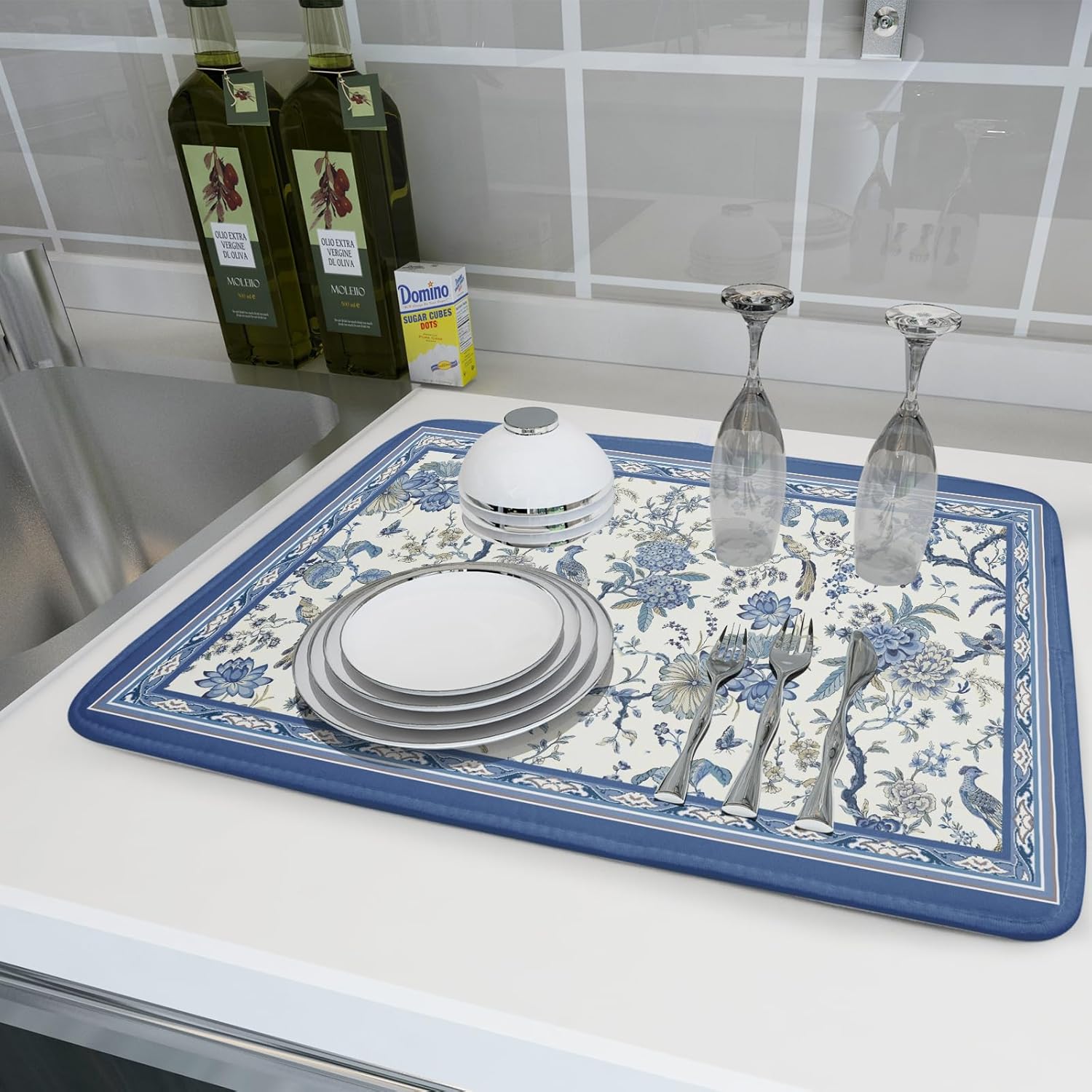 Giwawa Chinoiserie Dish Drying Mat 18x24in Blue White Oriental Floral Birds Kitchen Drainer Mats Porcelain Flowers Absorbent Microfiber Dish Drying Pad Large for Countertop Home Decor