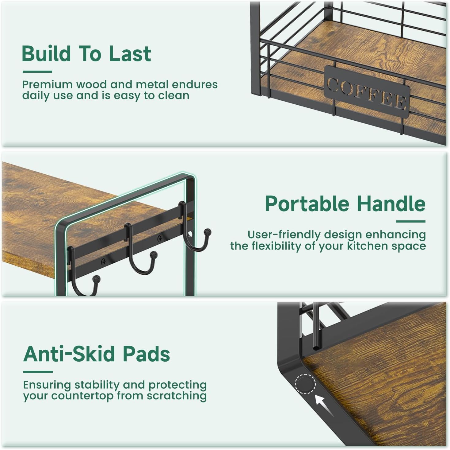 - Spacious Dual-Tier Storage: Transform your home coffee station with EsLuker.ly’s coffee cup holder for countertop, featuring two-tier shelves and 12 mug hooks. This design provides ample space for all your coffee essentials, meeting the storage needs of any family kitchen or office coffee station