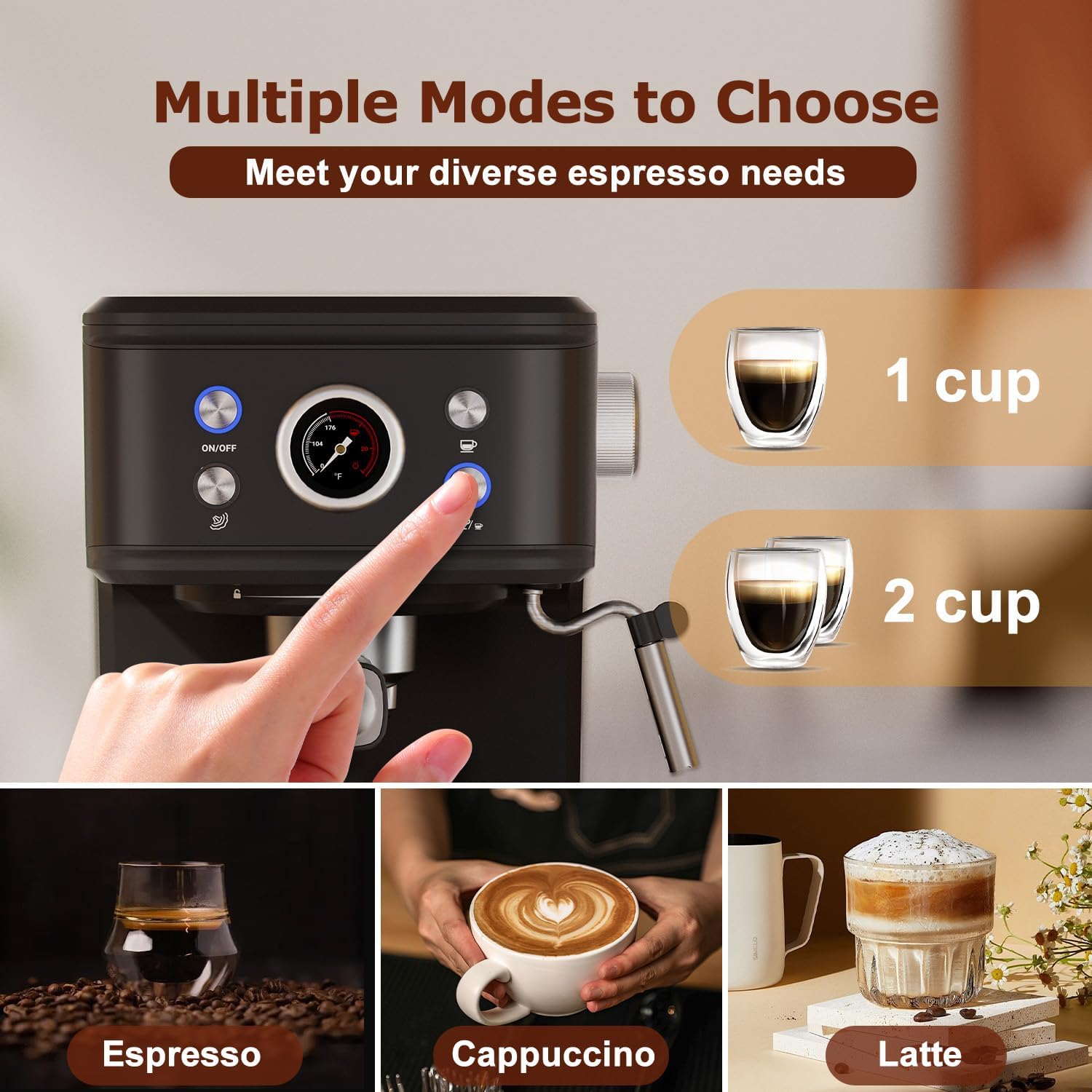 - ✨【20 Bar Pressure&1100W】- Empstorm espresso machine is equipped with a powerful 20-bar extraction pressure and uniform pressure technology, which can extract rich coffee crema during each extraction.The high power of 1100W can quickly heat up to 199.4°F within 75 seconds, and the dial can monitor real-time temperature.