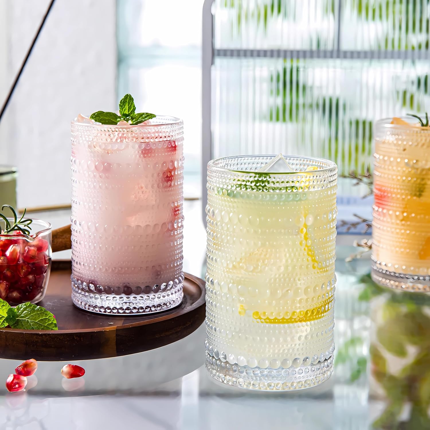 - 4pcs Iced Coffee Glasses: 14oz Iced Coffee glasses set includes 4 glass cups,4 bamboo lids,4 reusable glass straws and 1 cleaning brush, vintage hobnail drinking glasses design.