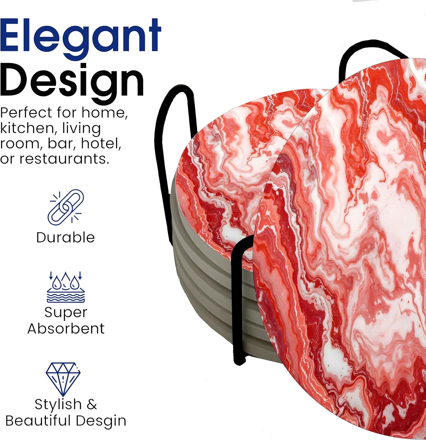 - Light Dark Red Maroon Multicolored Agate Slate or Marble Design Set of 6 Ceramic Coasters with Stand – Includes six stylish, 4-inch round drink coasters paired with a sleek metal stand for convenient storage, keeping your coasters neatly organized and within easy reach. Marble Pattern Coaster Set Makes a Great Gift - CST47