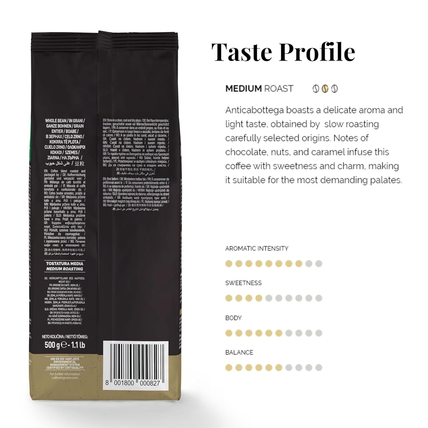 - Delicate Flavor Profile with Balanced Intensity: AnticaBottega boasts a sweet and delicate flavor profile with an intensity level of 5/10, striking the perfect balance between subtlety and richness. This medium roast coffee features a harmonious blend of chocolate, nuts, and caramel notes, making it the ideal choice for those who appreciate a smooth and refined coffee experience without overwhelming bitterness.
