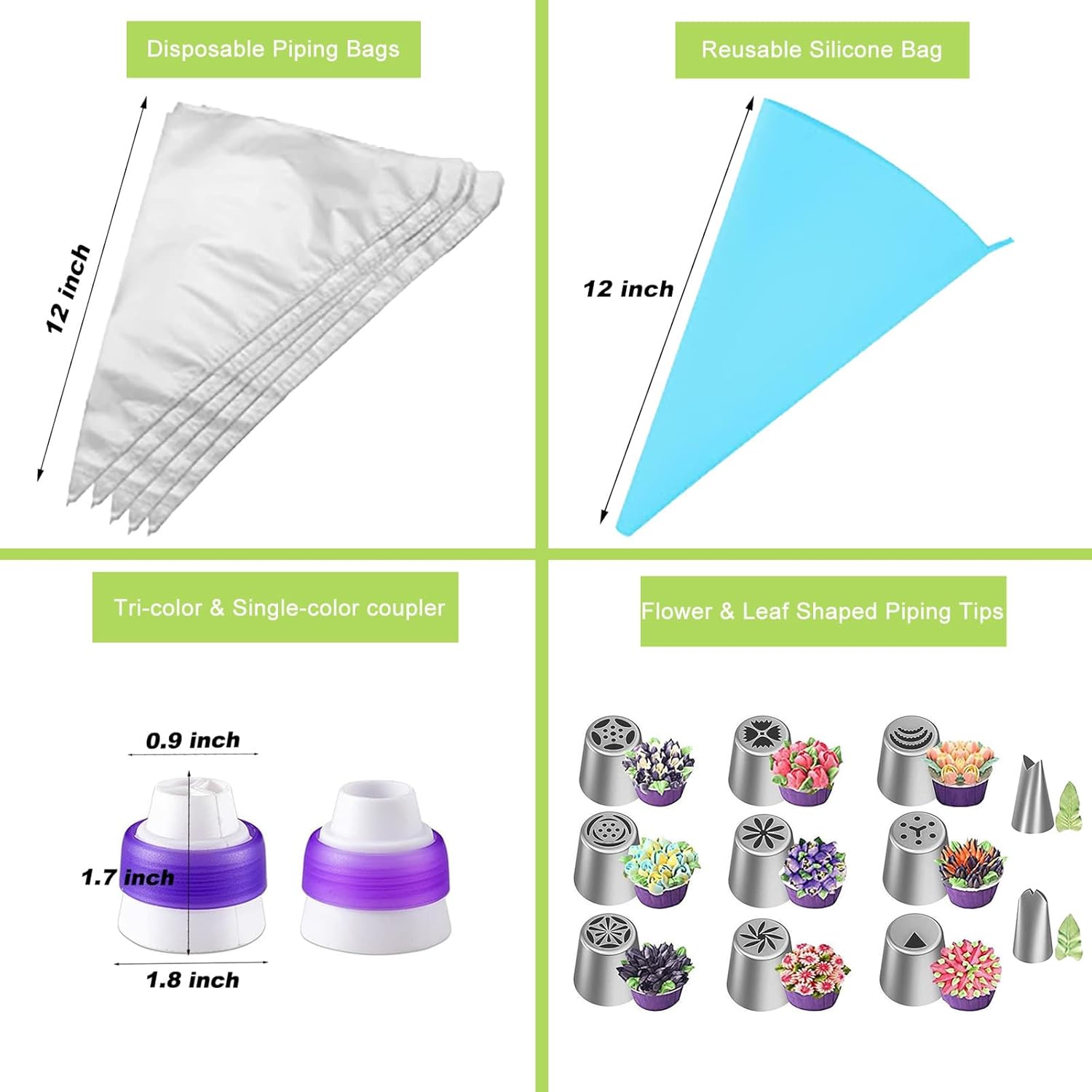 - 【24-Piece Cake Decorating Kit】 This frosting piping kit includes 9 russian piping tips, 1 three-hole coupler, 1 one-hole coupler, 10 disposable piping bags, 1 reusable piping bag, and 2 standard piping tips. Perfect for decorating cakes, cupcakes, cookies, and bread, this set meets all your baking decorating supplies needs.