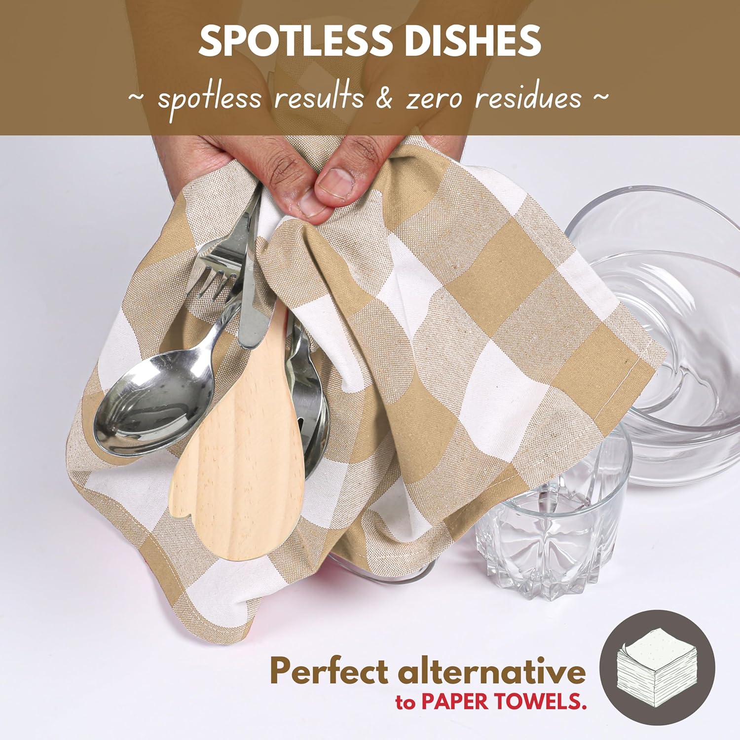 Native Fab 6 Pack Buffalo Check Kitchen Towels16 x26 - Cotton Dish Towels Washable - Absorbent Tea Towels, Soft Hand Towel with Hanging Loop, Dish Cloth Set - Beige White