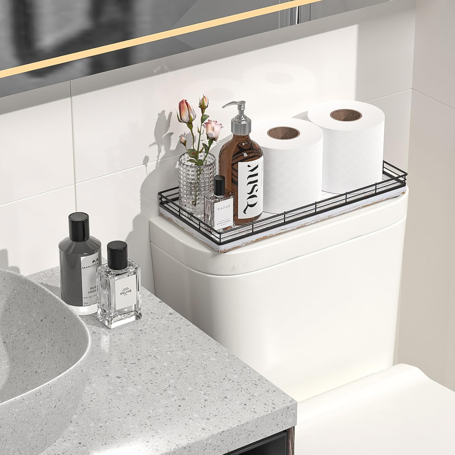 - Versatile Functionality: Elevate your daily routine with our toilet tank basket tray; Neatly arrange bathroom essentials such as toilet paper, lotions, scented candles and potted plants, keeping your countertop tidy; Add a touch of elegance to your dresser by using the bathroom vanity tray to display perfumes, jewelry, and cosmetics; Impress your guests with neatly arranged hand towels and toiletries organized on the large toilet tray for bathroom counter or use it as a kitchen soap tray