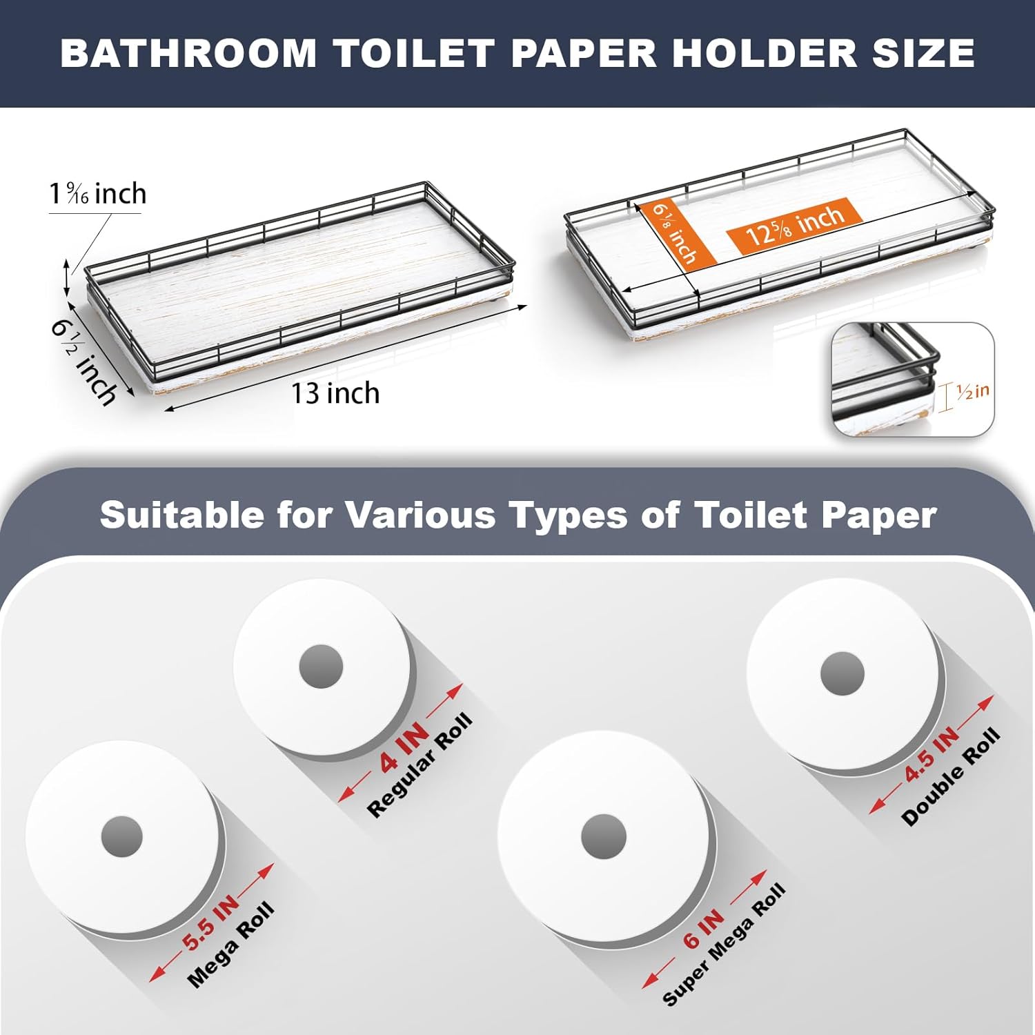 - Unique Charm: This 13 inches large wood rectangle toilet tank tray ensures durability and increased load-bearing capacity; Elevate your space with a unique appearance featuring a combination of iron mesh edges and farmhouse white wood board; Distinctive and captivating grain pattern adds an exquisite touch of elegance and sophistication; This bathroom toilet organizer tray blends modern minimalism with farmhouse charm seamlessly