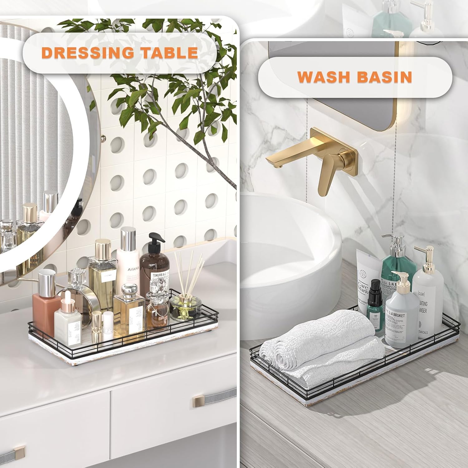 - Considerate Design: This bathroom trays for counter is ready to use without any installation required; Upgraded embedded welding design enhances stability and aesthetics; Raised edge prevent items from slipping; 4 non-slip pads on the bottom protect surfaces from scratches; Simplify your cleaning routine with just a quick wipe-down using a damp cloth, saving you time and hassle