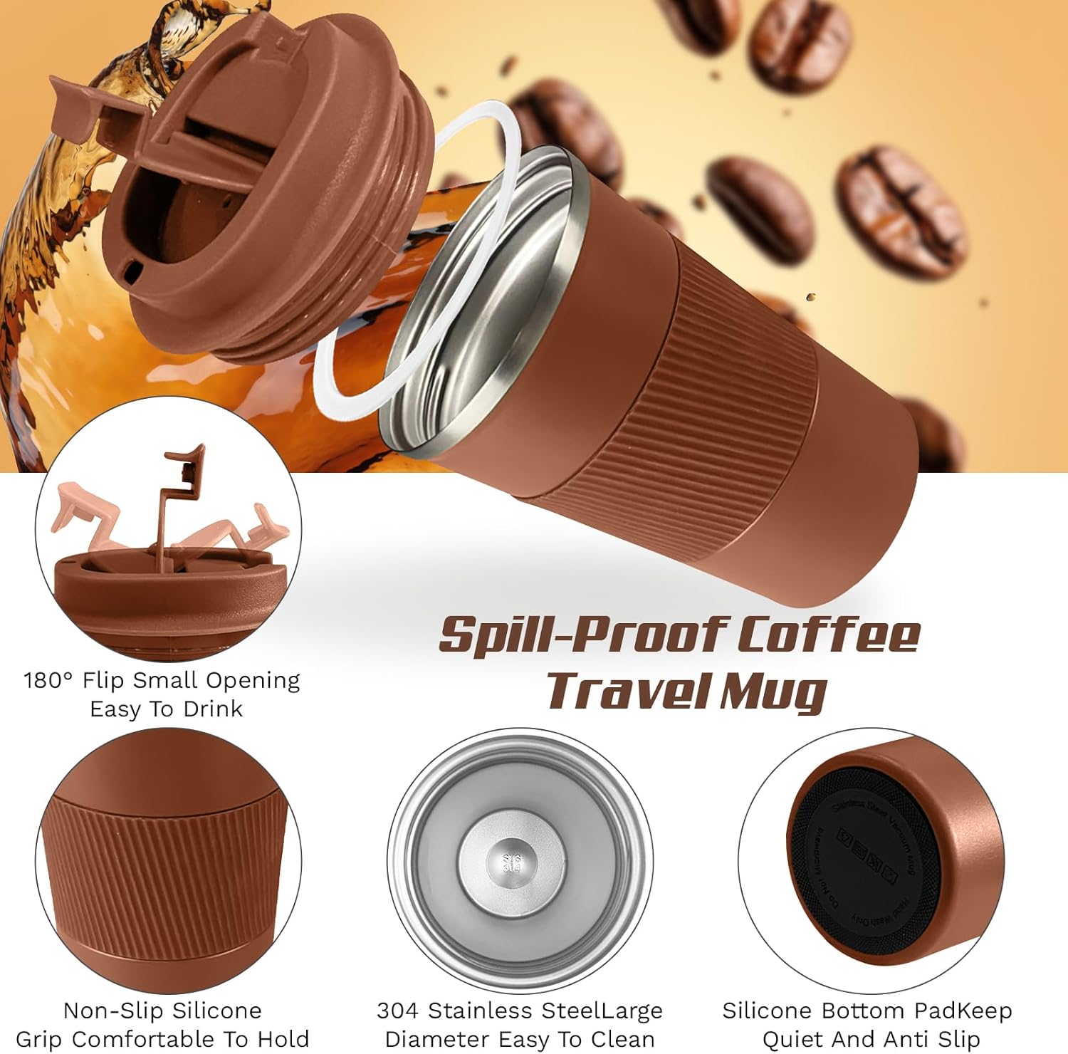 Vacuum-Insulated Stainless Steel Travel Coffee Mug, Leak-Proof Reusable Coffee Cup with Lid - Keep Hot & Cold Drinks for Hours, Durable Thermos Tumbler for Men & Women (3rd-Light Coffee, 17OZ)