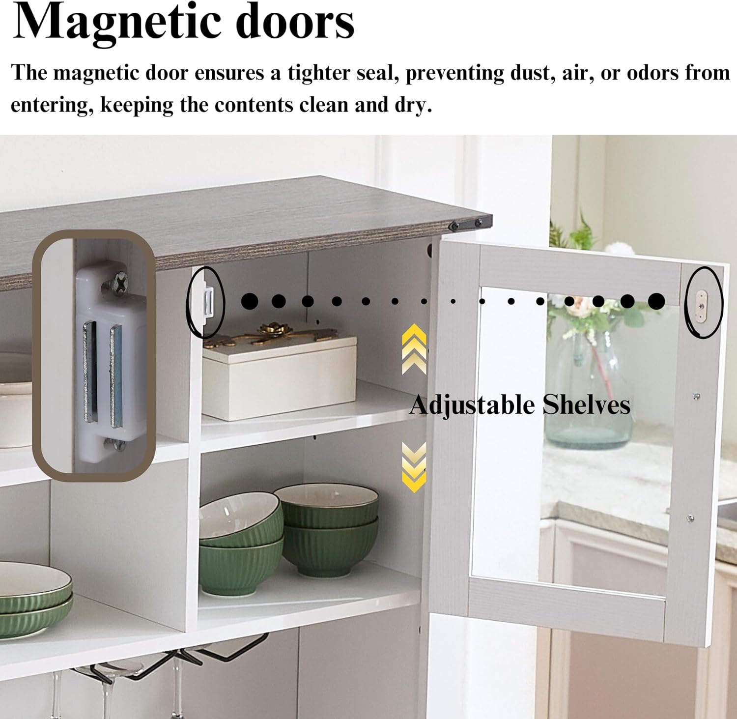 - Wine Glass Rack- Sliding Barn Doors- The two sliding barn doors feature a high-quality rail system, operating smoothly and quietly to save space while adding a retro-industrial touch. Inside, a spacious interior with three adjustable shelves accommodates wine bottles, glasses, or kitchen items, with the flexibility to fit standard-sized wine bottles for effortless storage