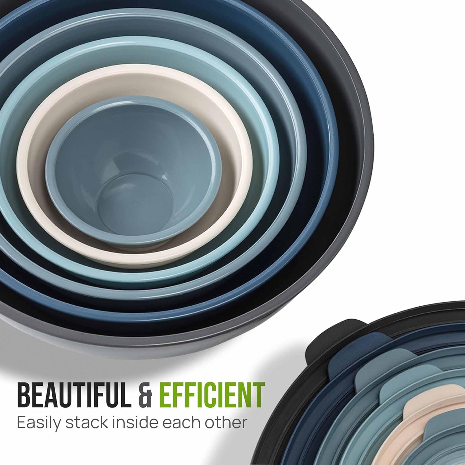 - STACKABLE, EASY TO CLEAN DESIGN: These nesting mixing bowls for kitchen can be stacked on top of each other to save space. The plastic bowls with lids are top-rack dishwasher friendly and can also be hand washed with soap and water (avoid the use of abrasive sponges).