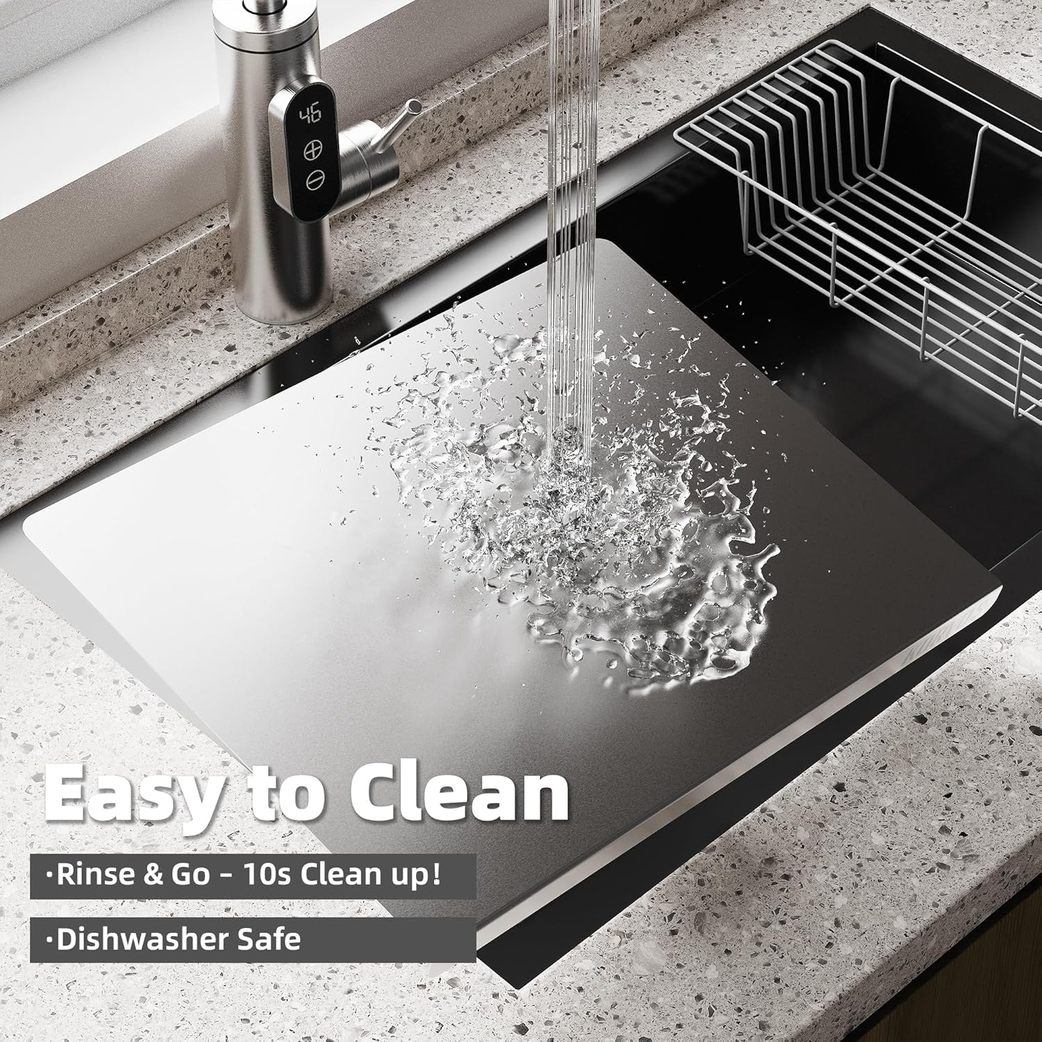 - Anti-slip Design: This metal chopping board comes with a removable silicone anti-slip mat that keeps the board steady while chopping. The mat not only reduces noise but also protects your countertop from scratches, making it practical for everyday use
