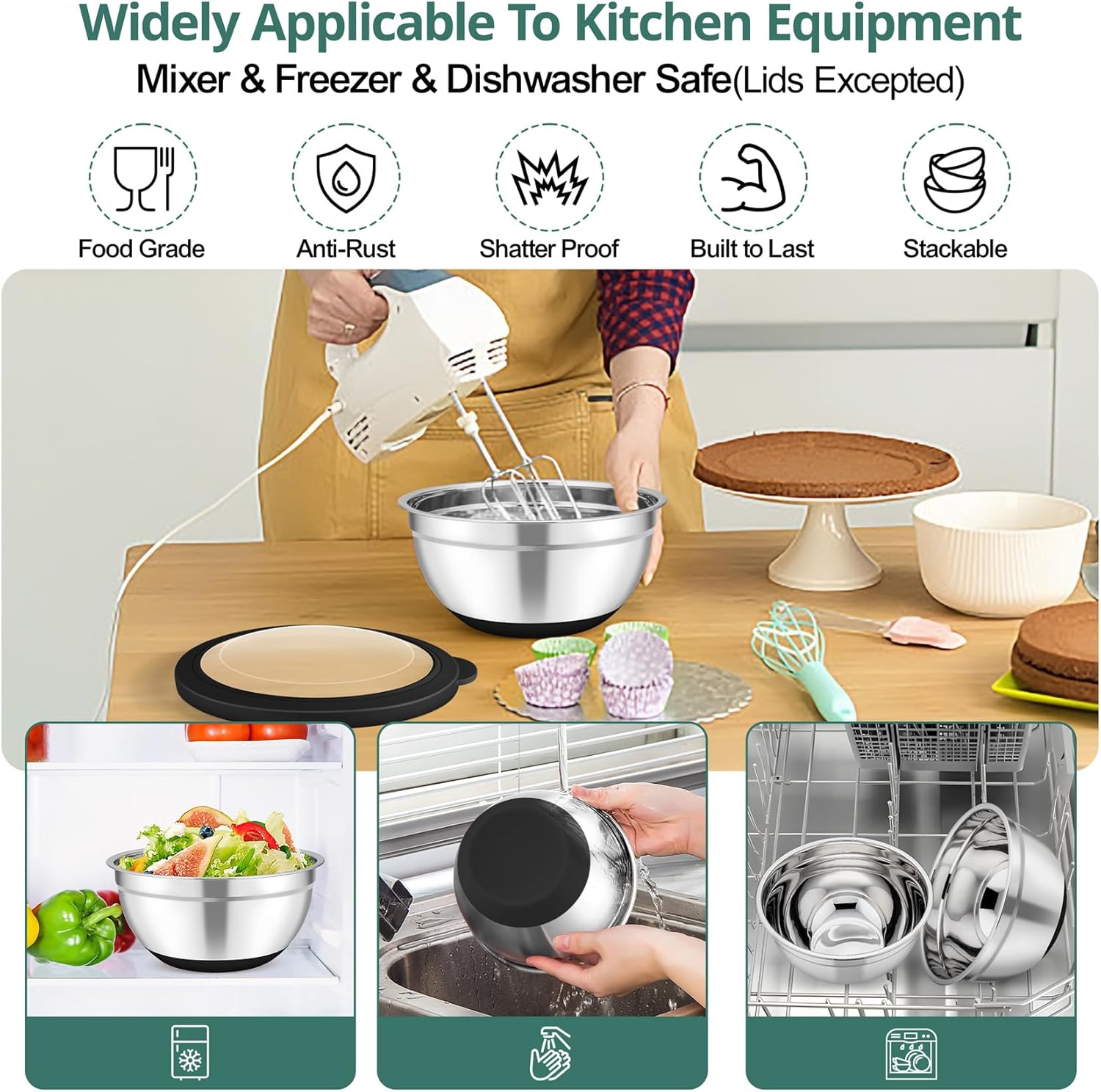 - FOOD-SAFE & LONGEVITY: Our mixing bowls with lids set is made of food grade stainless steel and non-toxic plastic lids, No harmful chemicals to ensure users’ health and safety, Rust and chip resistant, Heavy duty construction make them not easy to break and deform, Stand the test of time and great for long-term use, A huge plus – the bowls are oven safe except for the lids