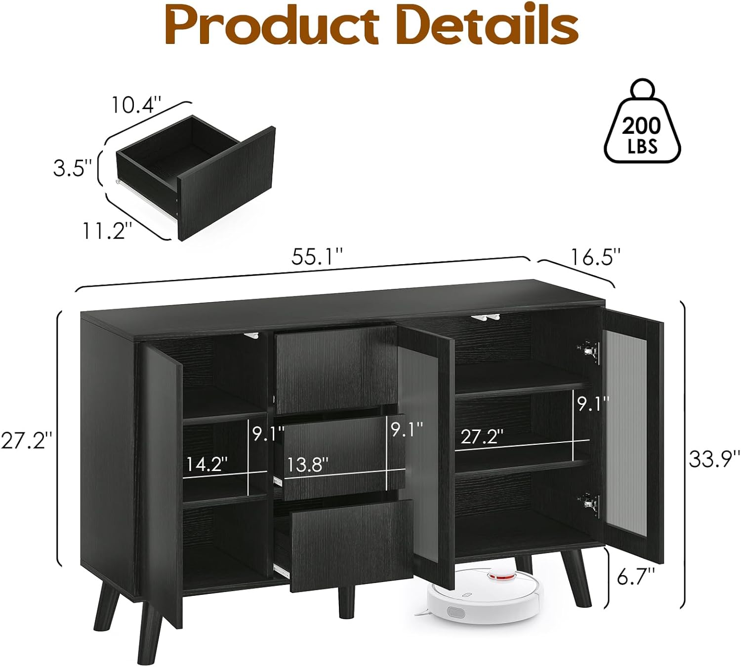 - Generous· Storage Capacity: This timeless American Farmhouse-style buffet cabinet features three spacious drawers, designed to enhance both functionality and storage versatility. The drawers provide ample room to neatly organize and store a variety of items, from dinnerware to household accessories, while maintaining privacy. With easy access and efficient organization, these drawers help keep your home tidy, stylish, and effortlessly functional.