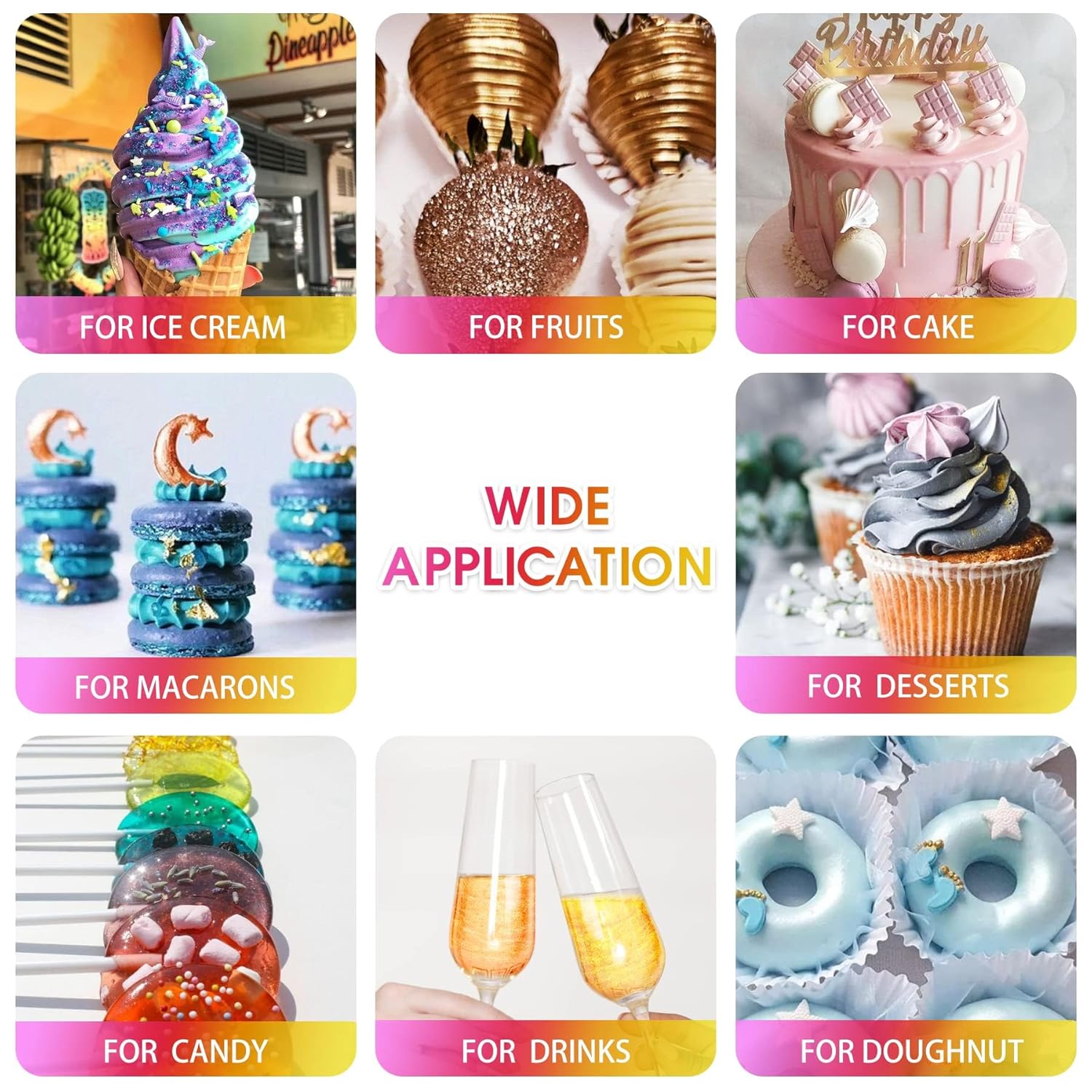 - WIDE RANGE OF USES - A tiny amount of drink glitter powder is enough to create a stunning effect. This food coloring glitter powder can add a luxury shimmer to cakes decorating, cupcakes, cookies, wine, cocktails, champagne, and other baked goods and beverage.