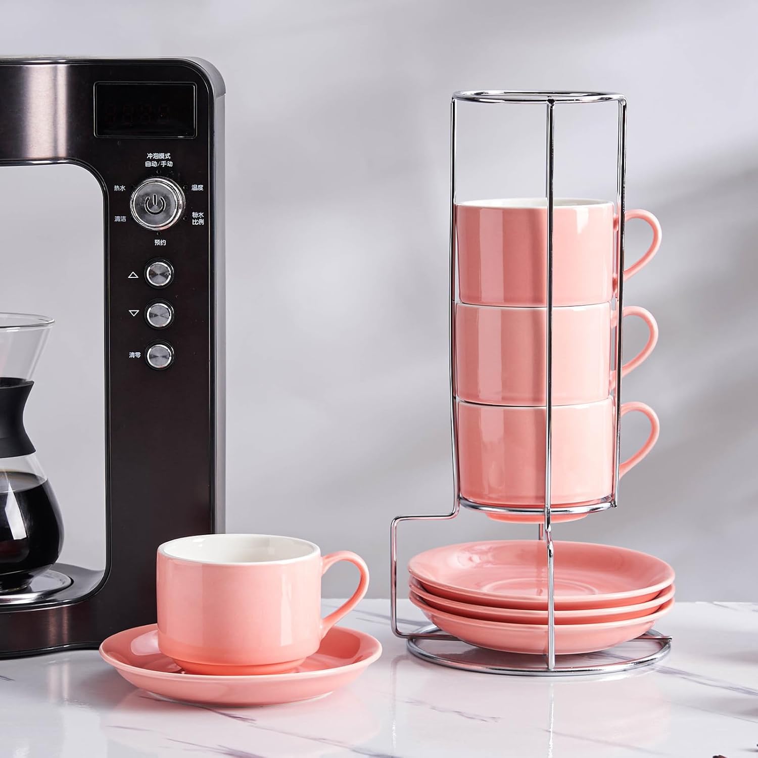 - The cups and saucers can be stacked neatly on the metal stand for easy organization, keeping your coffee corner clean and tidy. Say goodbye to clutter and embrace the simplicity of an organized life.