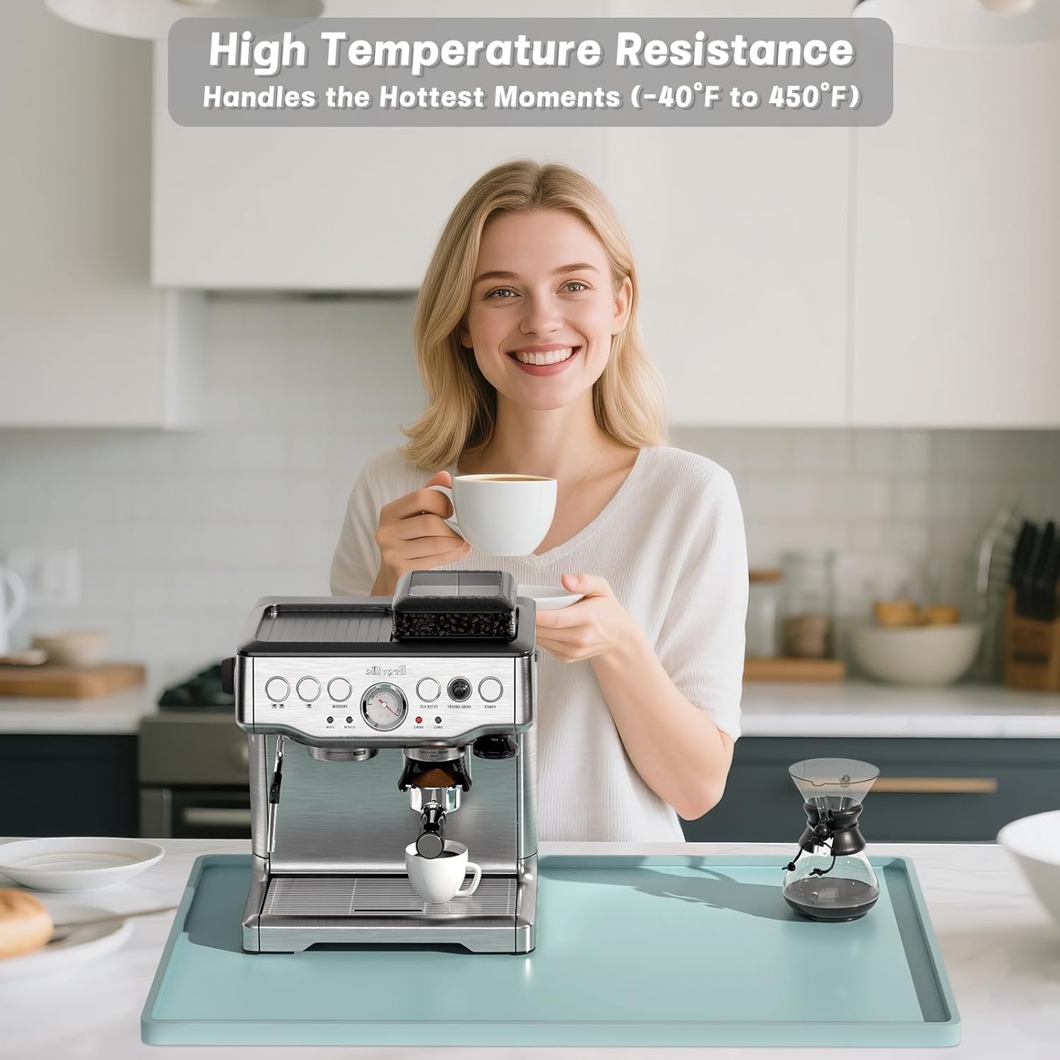 - Heat-Resistant Counter Protector: 0.4" raised edges trap spills (holds 8oz liquid). Withstands -40°F to 450°F – safely place hot espresso portafilters or boiling kettles directly on the mat. Protect marble, wood, or glass countertops from burns