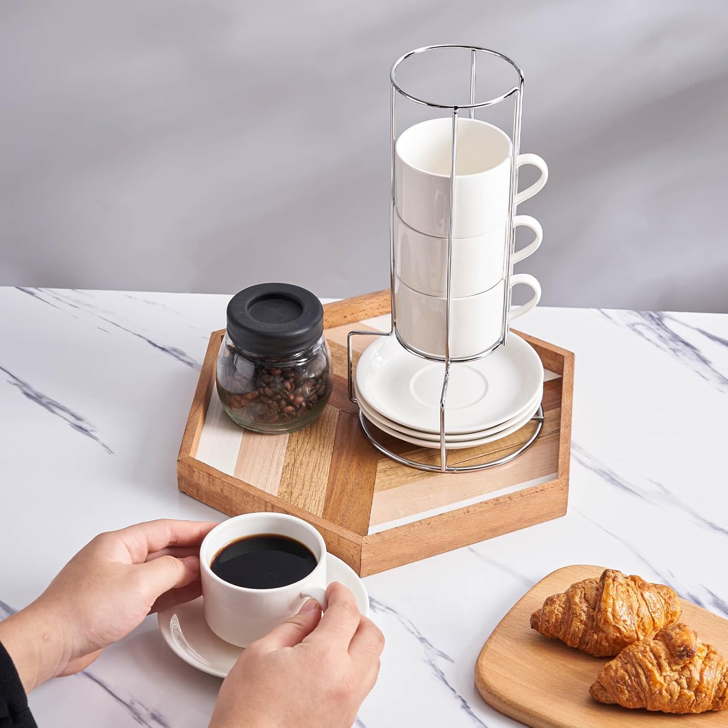 - The cups and saucers can be stacked neatly on the metal stand for easy organization, keeping your coffee corner clean and tidy. Say goodbye to clutter and embrace the simplicity of an organized life.