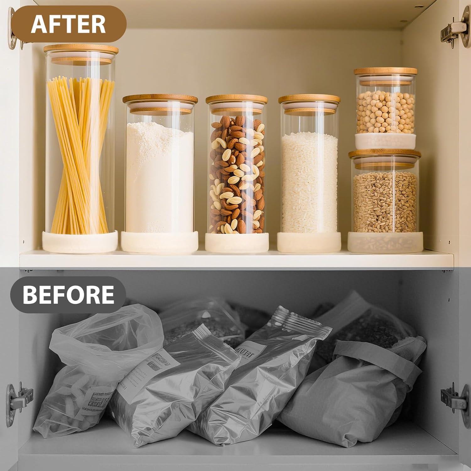 - Mixed Sizes for Versatile Storage – Includes 7 round glass jars set in assorted sizes (17oz/25oz/34oz/53oz/73oz), meeting all your kitchen organization needs from spices to bulk pantry staples.