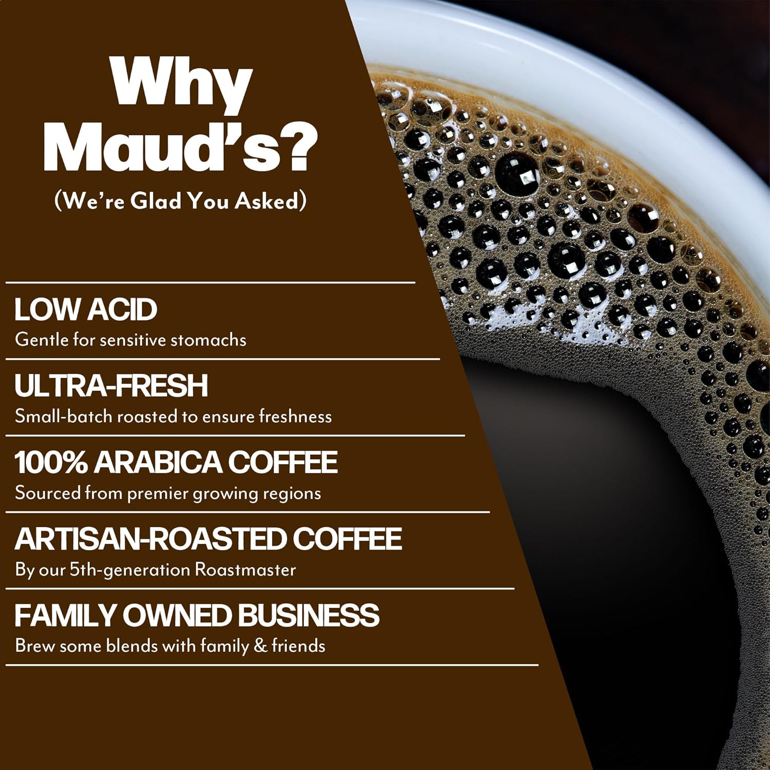 - [Maud’s Legacy]: As a small, family-owned business, we treat our customers like family. If you're ever unsatisfied with our dark roast coffee pods, we promise to make it right. Committed to sustainability, we make sure that every step we take in bringing you your favorite coffee is thoughtful, ethical, and environmentally responsible, and produce our products in a solar-powered facility.