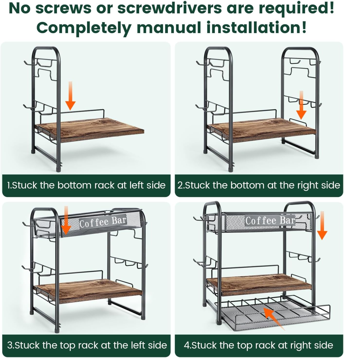 Coffee Bar Organizer, Station Mug Holder for Countertop, Multi-Functional 3 Tier Coffee Cup Tree Rack for Kitchen, Storage Shelf with 10 Hooks, K Cup Pod Organizer Drawer for Home Office