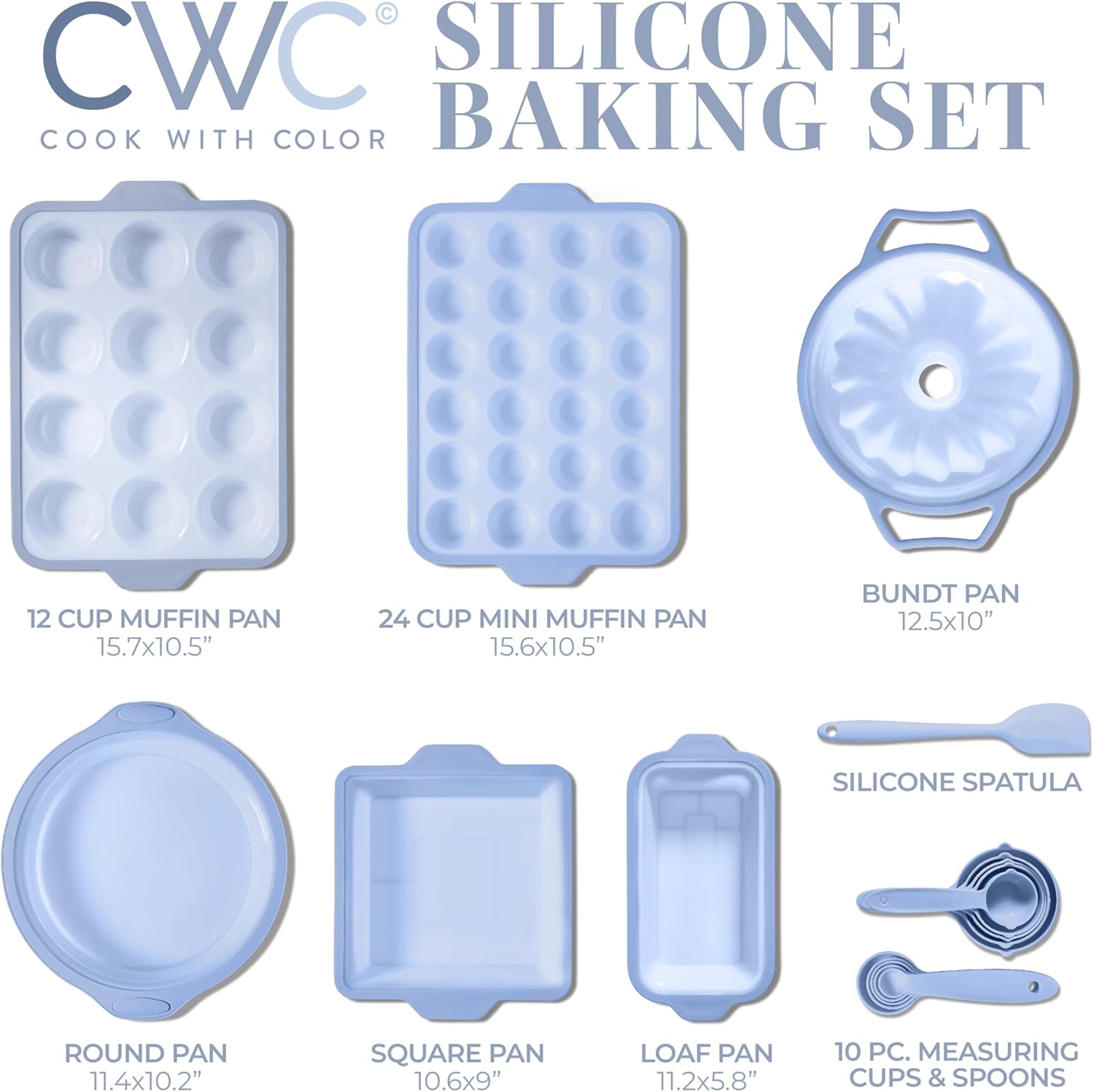 COOK WITH COLOR 17 Pc. Silicone Baking Pan Set - Non-Stick & Easy Clean Silicone Muffin Pans for Baking with Sturdy Metal Frame for Stability, Flexible Cake Molds, Includes Measuring Cups and Spoons