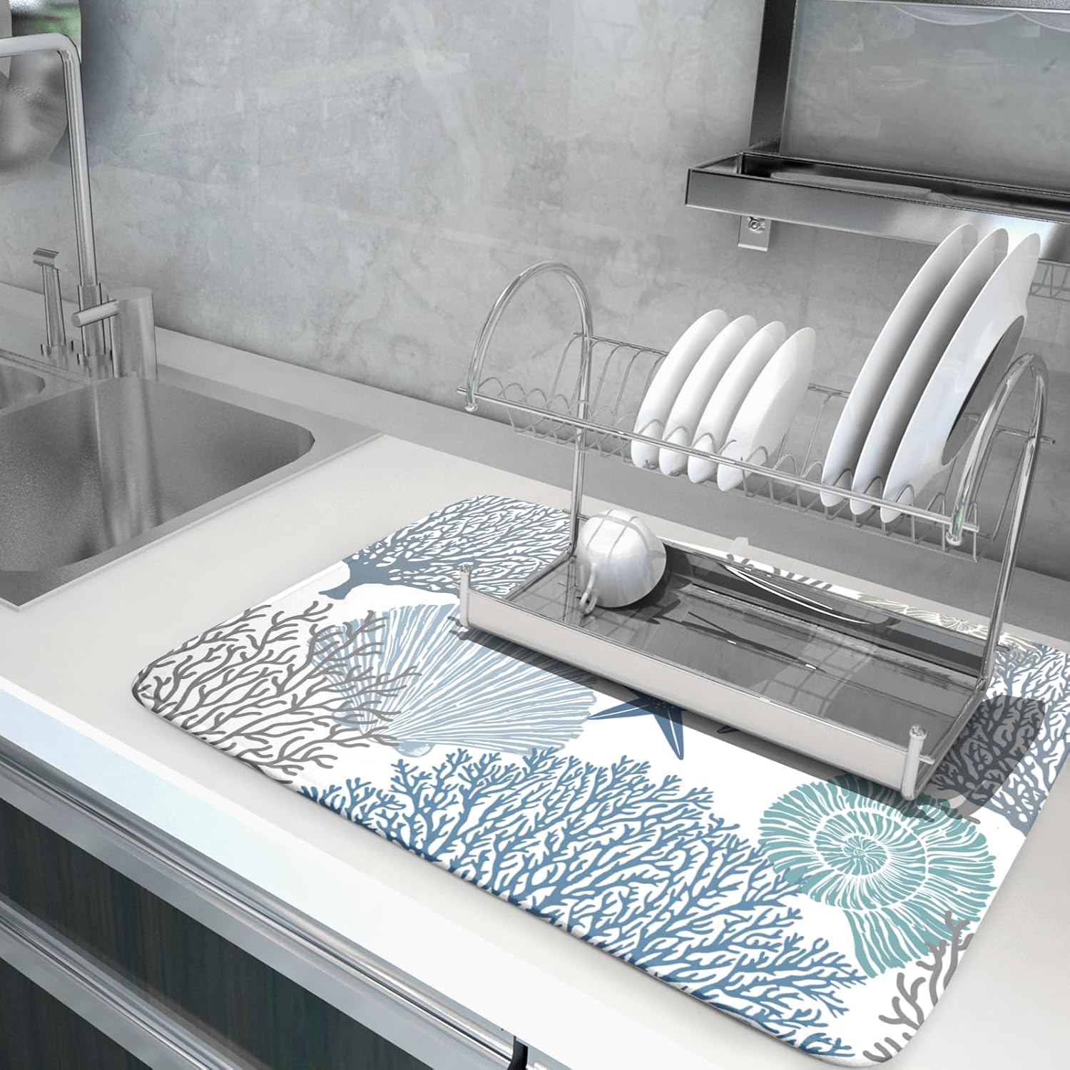 Summer Coastal Dish Drying Mats for Kitchen Counter 16x18 Inch Sea Shells Starfish Drying Mat High Absorbent Reversible Kitchen Mat Blue Coral Ocean Themed Dishes Pad for Countertop Tableware Decor