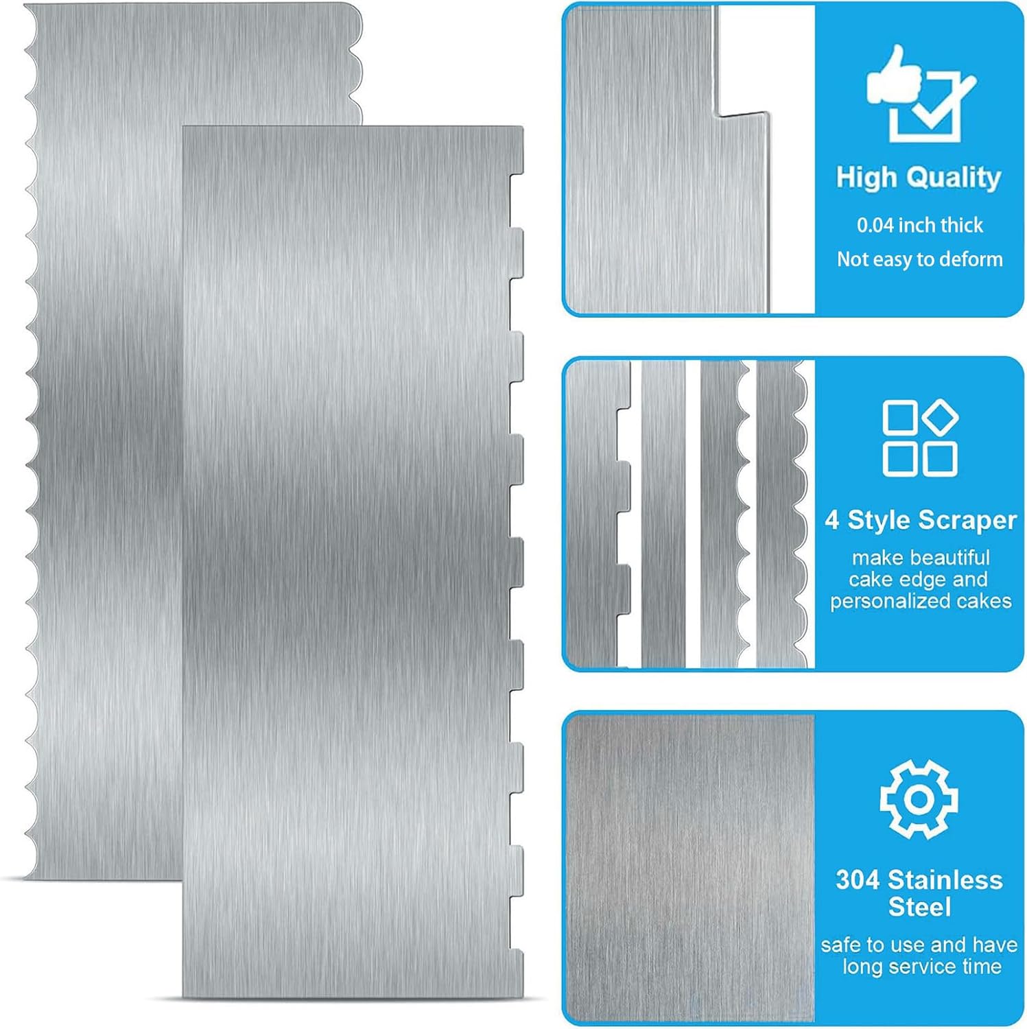 - What’s Included Each package includes 2 stainless steel cake scraper with 2 patterns (smooth edge and striped edge). Measuring 8.7 inches, it’s the perfect size for handling cakes of all shapes and sizes. Whether you’re a beginner or a pro, this tool will help you create beautiful, professional-quality cakes every time