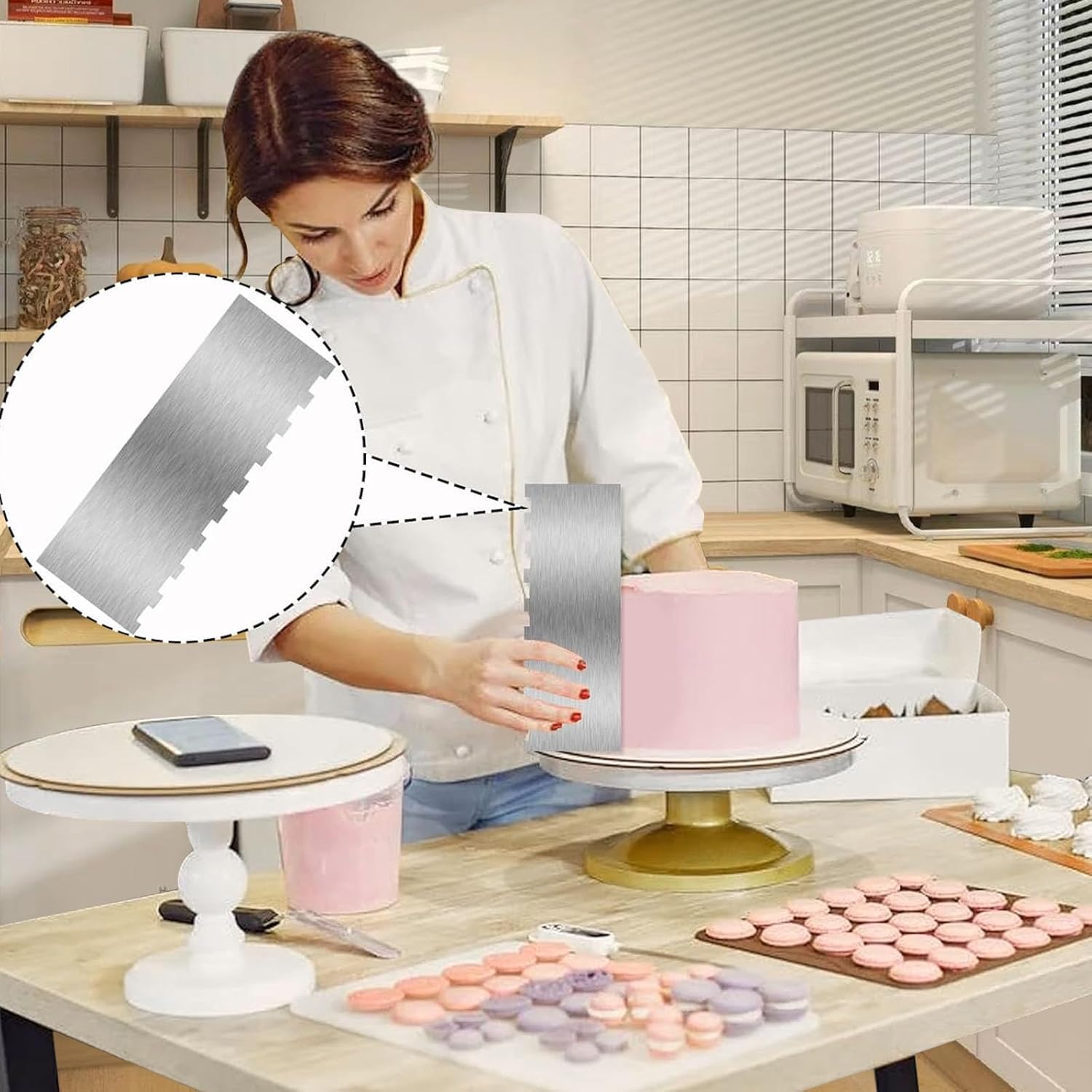 - Easy to Use for Stunning Results Simply apply buttercream or frosting to your cake, press the scraper against the edge, and rotate your cake turntable for smooth, uniform designs. The handleless design ensures maximum control, even when decorating larger cakes, allowing you to create personalized and intricate patterns effortlessly