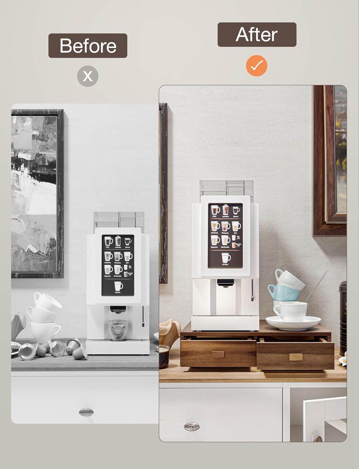 - No Assembly Required: Ready to use right out of the box, this all-in-one coffee drawer simplifies your setup. No tools, no hassle, just instant organization