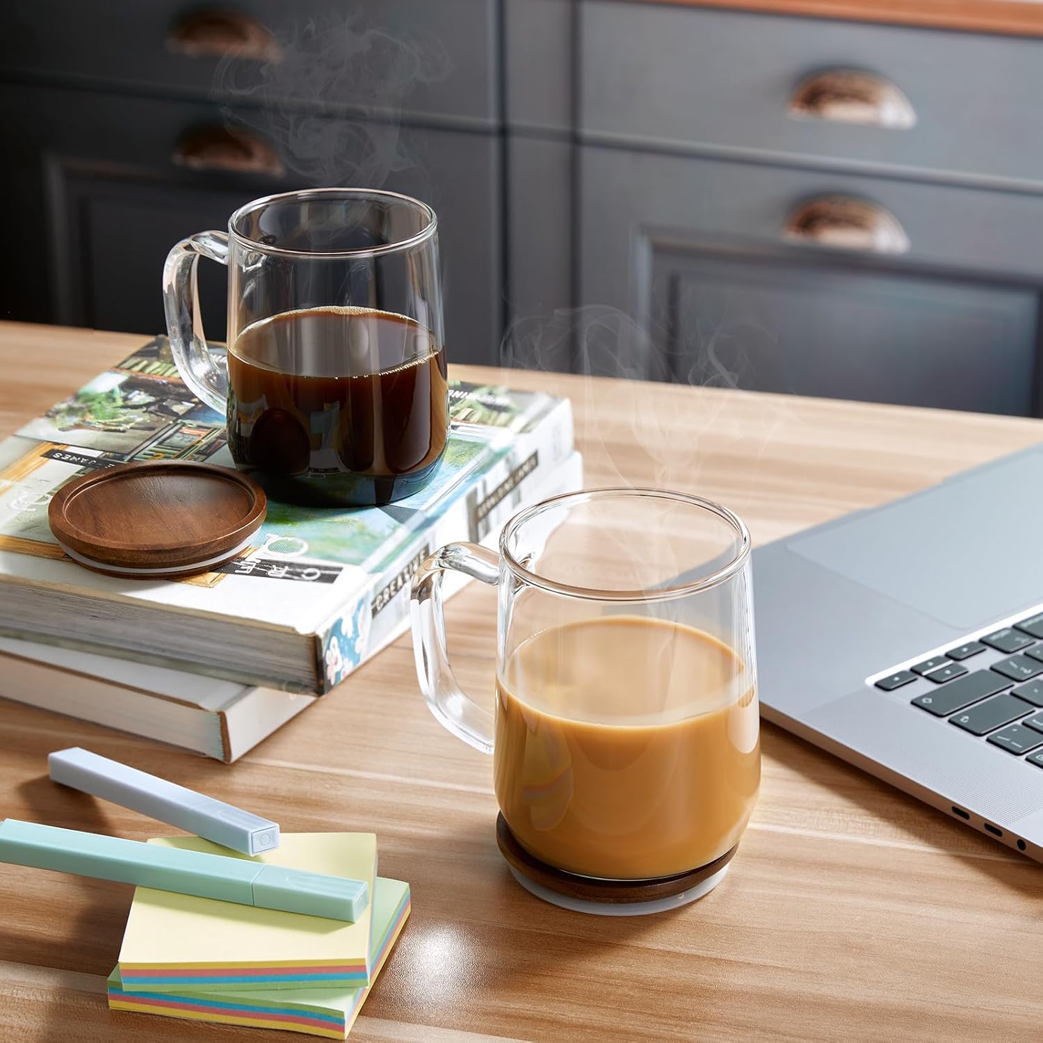 Glass Coffee Mugs, 14 oz Glass Coffee Cups with Acacia Wood Lids, Clear Borosilicate Glass Mugs with Handles for Cappuccino, Tea, Latte, Hot/Cold Beverages, Wine, Americano, Set of 2