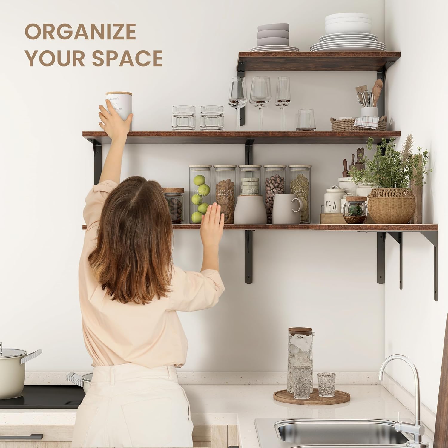 - 【Strong & Durable Construction for Long-Lasting Use】Constructed from high-quality, smooth-finished MDF, these wall shelves provide a sturdy and attractive foundation that resists warping and scratching over time. The robust black L-shaped metal brackets are designed from industrial-grade steel, ensuring excellent support and stability. Each shelf can bear up to 50 lbs when properly installed, allowing you to confidently store heavier items like books, cookware, or collectibles without worry.