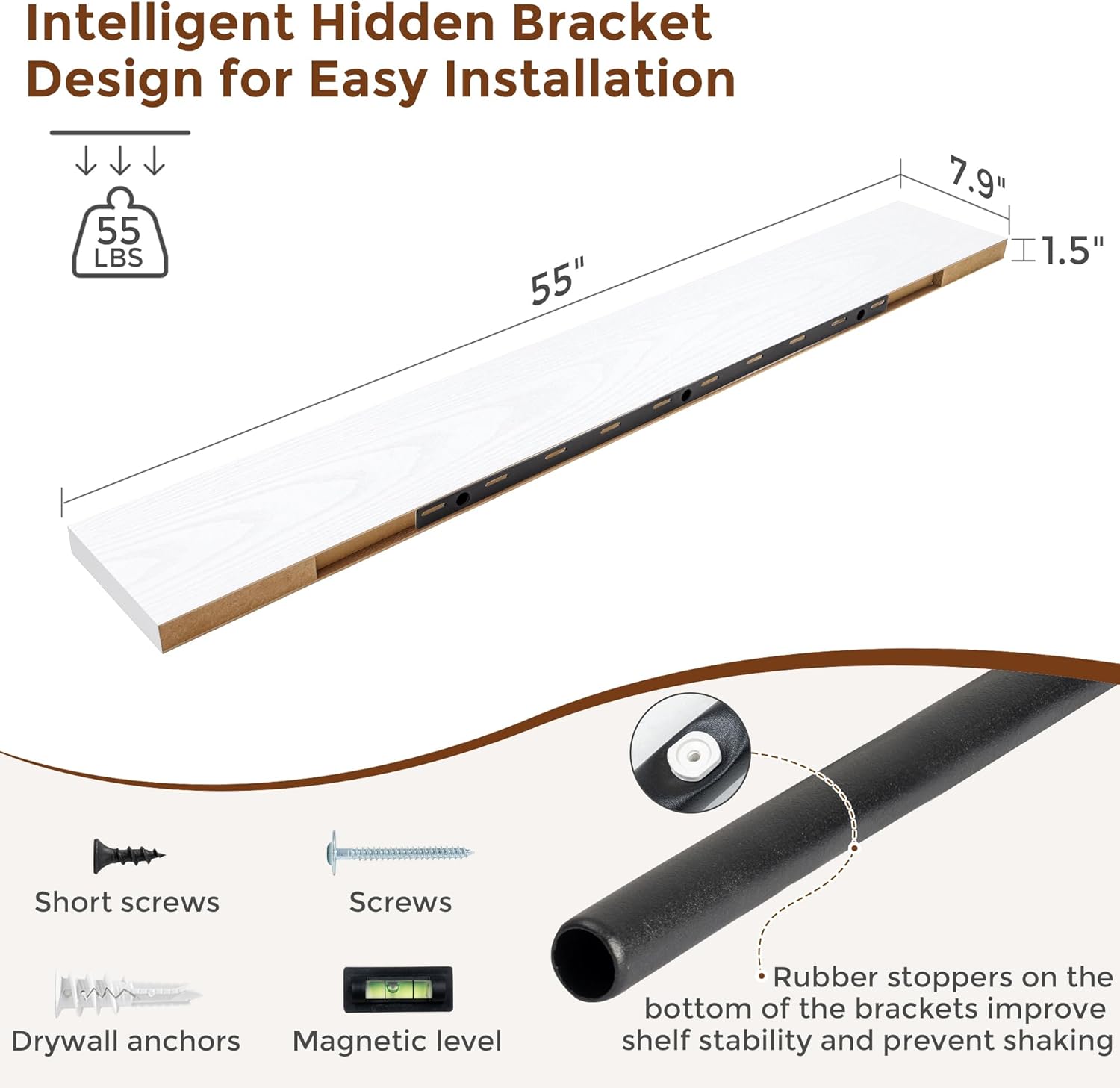 Heimlove 55 Inch Floating Shelves for Wall 8 Inch Deep White Shelves Set of 2,Wall Mounted Rustic Wood Long Floating Shelf,Large Extra Display & Storage Shelf with Invisible Brackets
