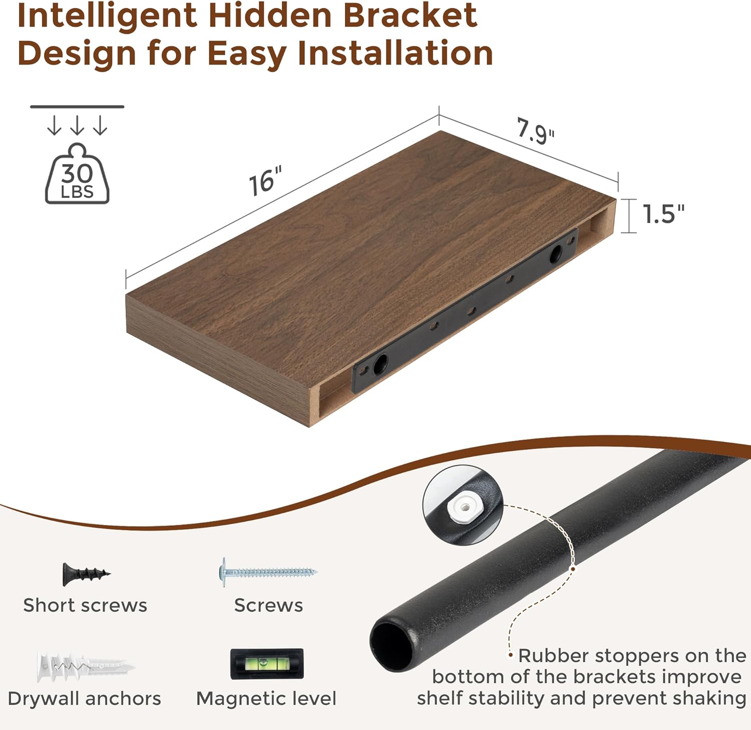 - 【Sturdy Support】Make the most of your wall space with our 16 x 8 inch walnut floating shelves for wall for room wall. At 1.5 inches thick, they offer sturdy support for your plants and decorative pieces. Each shelf can hold up to 30 lbs, ensuring your items never sag or fall.